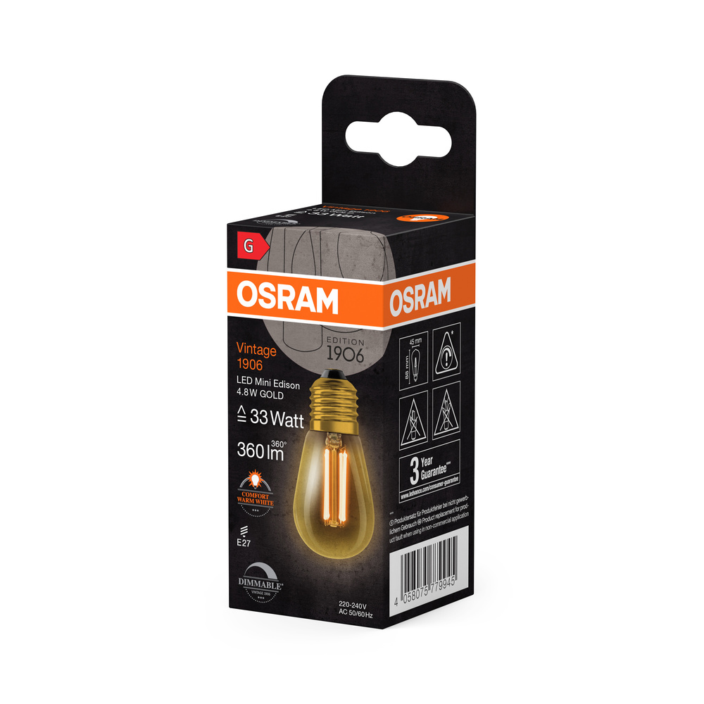 Ściemnialne lampy LED , edycja vintage, klasyczny kształt żarówki Edisona. Cechy produktu: Lampy LED dla napięcia sieciowego. Lampa wykonana ze szkła. Trwałość do 15 000 h. Kąt wiązki światła: do 360°. Ściemnialne. Dobra jakość światła, wskaźnik oddawania barw Ra: ≥ 80; stała chromatyczność. Zalety produktu: Niższe zużycie energii w porównaniu do lamp żarowych lub halogenowych. Natychmiast 100 % światła, bez czasu nagrzewania. Łatwy montaż zamiast zwykłych żarówek. Lampy wyposażone w innowacyjną technologię „włókien” LED. Obszary zastosowań: Doskonałe rozwiązanie do instalacji dekoracyjnych. Zastosowania domowe. Oświetlenie ogólne. Do użytku na zewnątrz tylko w odpowiednich oprawach zewnętrznych. Porady dotyczące bezpieczeństwa: Nie dotykaj lampy, jeśli jest stłuczona.. Nie wolno używać, jeśli zewnętrzne źródło światła jest uszkodzone..