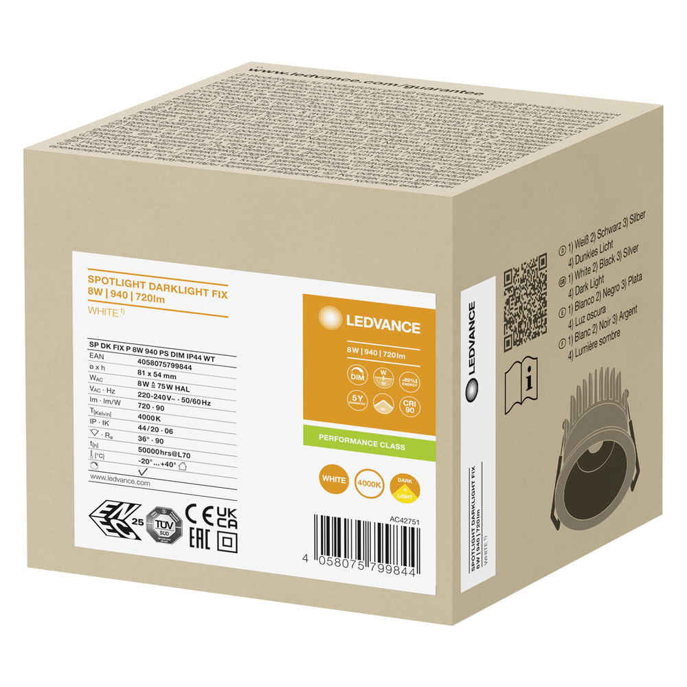 Oprawa punktowa (Spot) z ograniczeniem efektu olśnienia UGR<19, stała. Cechy produktu: Wskaźnik oddawania barw Ra: 90. Stopień ochrony: IP44 (od strony pomieszczenia). Obudowa z odlewu ciśnieniowego aluminium. Sprężyny zabezpieczone podkładkami silikonowymi. Ściemnialne (za pomocą licznych popularnych ściemniaczy, zobacz więcej www.ledvance.pl/dim). Możliwość wykorzystania wewnętrznego okablowania. Zalety produktu: Darklight: Specjalna konstrukcja zapewniająca większy komfort przy niskim olśnieniu. Wyjątkowo małe wymiary ramki. Powerselect: Regulacja mocy za pomocą przełączników DIP na sterowniku. Łatwa wymiana zewnętrznego zasilacza dzięki wtyczce z zatrzaskiem bagnetowym. Łatwa instalacja i podłączenie elektryczne dzięki beznarzędziowym złączom elektrycznym. SCALE Design – świetny wygląd, wysokiej jakości materiały i niewielkie wymiary wpasowują się w każde otoczenie. 5-letnia gwarancja. Obszary zastosowań: Bezpośredni zamiennik halogenowych opraw reflektorowych. Oświetlenie ogólne. Pokoje hotelowe i korytarze. Bary, restauracje. Oświetlenie akcentujące. Galerie, muzea. Pomieszczenia mieszkalne. Wyposażenie / Akcesoria: Zewnętrzny osprzęt sterujący w zestawie z przełącznikami DIP do wyboru mocy podczas instalacji. Pierścienie są dostępne jako akcesoria. Wybrany sterownik DALI 2.0 dostępny jako wyposażenie dodatkowe. Porady dotyczące bezpieczeństwa: Wszystkie podłączenia elektryczne muszą być wykonane przez osobę wykwalifikowaną.. Uwaga, ryzyko porażenia prądem.. Oprawy nie nadają się do pokrywania materiałem termoizolacyjnym..