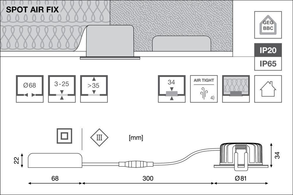Oprawa punktowa (Spot) do wbudowania, o niskim zużyciu energii, do zastosowania w cienkich sufitach, stała. Cechy produktu: Wskaźnik oddawania barw Ra: 90. Stopień ochrony: IP65 (od strony pomieszczenia). Obudowa z odlewu ciśnieniowego aluminium. Sprężyny zabezpieczone podkładkami silikonowymi. Ściemnialne (za pomocą licznych popularnych ściemniaczy, zobacz więcej www.ledvance.pl/dim). Możliwość wykorzystania wewnętrznego okablowania. Zalety produktu: Hermetyczna konstrukcja zapewniająca mniejsze ulatnianie się powietrza i ograniczoną utratę energii. Możliwość pokrycia wieloma rodzajami materiałów termoizolacyjnych. Niski profil umożliwia instalację w płytkich przestrzeniach sufitowych. Powerselect: Regulacja mocy za pomocą przełączników DIP na sterowniku. Łatwa wymiana zewnętrznego zasilacza dzięki wtyczce z zatrzaskiem bagnetowym. Łatwa instalacja i podłączenie elektryczne dzięki beznarzędziowym złączom elektrycznym. SCALE Design – świetny wygląd, wysokiej jakości materiały i niewielkie wymiary wpasowują się w każde otoczenie. 5-letnia gwarancja. Obszary zastosowań: Bezpośredni zamiennik halogenowych opraw reflektorowych. Sufity w domach energooszczędnych. Oświetlenie ogólne. Pokoje hotelowe i korytarze. Bary, restauracje. Oświetlenie akcentujące. Pomieszczenia mieszkalne. Wyposażenie / Akcesoria: Zewnętrzny osprzęt sterujący w zestawie z przełącznikami DIP do wyboru mocy podczas instalacji. Porady prawne: Należy przestrzegać wskazówek dotyczących instalacji znajdujących się w aktualnej instrukcji użytkownika (www.ledvance.com). Porady dotyczące bezpieczeństwa: W przypadku zastosowania folii paroizolacyjnej należy zastosować przekładkę SP HOLDER!. Wszystkie podłączenia elektryczne muszą być wykonane przez osobę wykwalifikowaną.. Uwaga, ryzyko porażenia prądem..