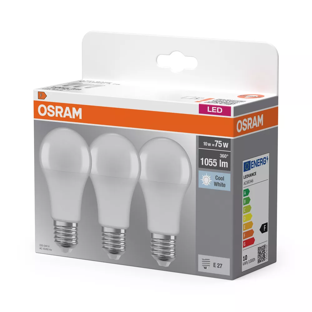 Lampy LED, klasyczny kształt żarówki. Cechy produktu: Profesjonalne lampy dla napięcia sieciowego. Brak możliwości regulacji strumienia świetlnego. Trzonek: E27, B22d. Lampy niezawierające rtęci. Zalety produktu: Niższe zużycie energii w porównaniu do lamp żarowych lub halogenowych. Odporność na wstrząsy i drgania dzięki technologii LED. Brak promieniowania UV i podczerwonego w wiązce światła. Natychmiast 100 % światła, bez czasu nagrzewania. Łatwy montaż zamiast zwykłych żarówek. Niskie obciążenie cieplne (w porównaniu ze standardowym produktem referencyjnym). Obszary zastosowań: Zastosowania domowe. Oświetlenie ogólne. Do użytku na zewnątrz tylko w odpowiednich oprawach zewnętrznych. Porady dotyczące bezpieczeństwa: Nie dotykaj lampy, jeśli jest stłuczona.. Nie wolno używać, jeśli zewnętrzne źródło światła jest uszkodzone..