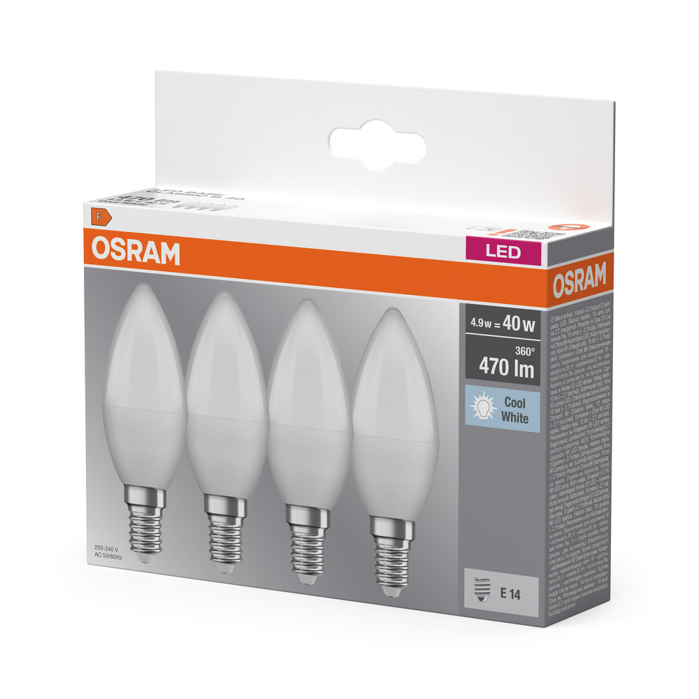 Lampy LED w kształcie klasycznej żarówki świecowej. Cechy produktu: Profesjonalne lampy dla napięcia sieciowego. Nieprzystosowane do pracy z regulatorami. Dobre oddawanie barw (Ra ≥ 80) i stabilność braw przez cały czas eksploatacji lampy. Trzonek: E14, B22d. Lampy niezawierające rtęci. Zalety produktu: Niskie obciążenie cieplne (w porównaniu ze standardowym produktem referencyjnym). Niższe zużycie energii w porównaniu do lamp żarowych lub halogenowych. Odporność na wstrząsy i drgania dzięki technologii LED. Brak promieniowania UV i podczerwonego w wiązce światła. Natychmiast 100 % światła, bez czasu nagrzewania. Bezpośrednio zastępuje zwykłe żarówki. Obszary zastosowań: Oświetlenie ogólne. Zastosowania domowe. Żyrandole. Do użytku na zewnątrz tylko w odpowiednich oprawach zewnętrznych. Porady dotyczące bezpieczeństwa: Nie dotykaj lampy, jeśli jest stłuczona.. Nie wolno używać, jeśli zewnętrzne źródło światła jest uszkodzone..
