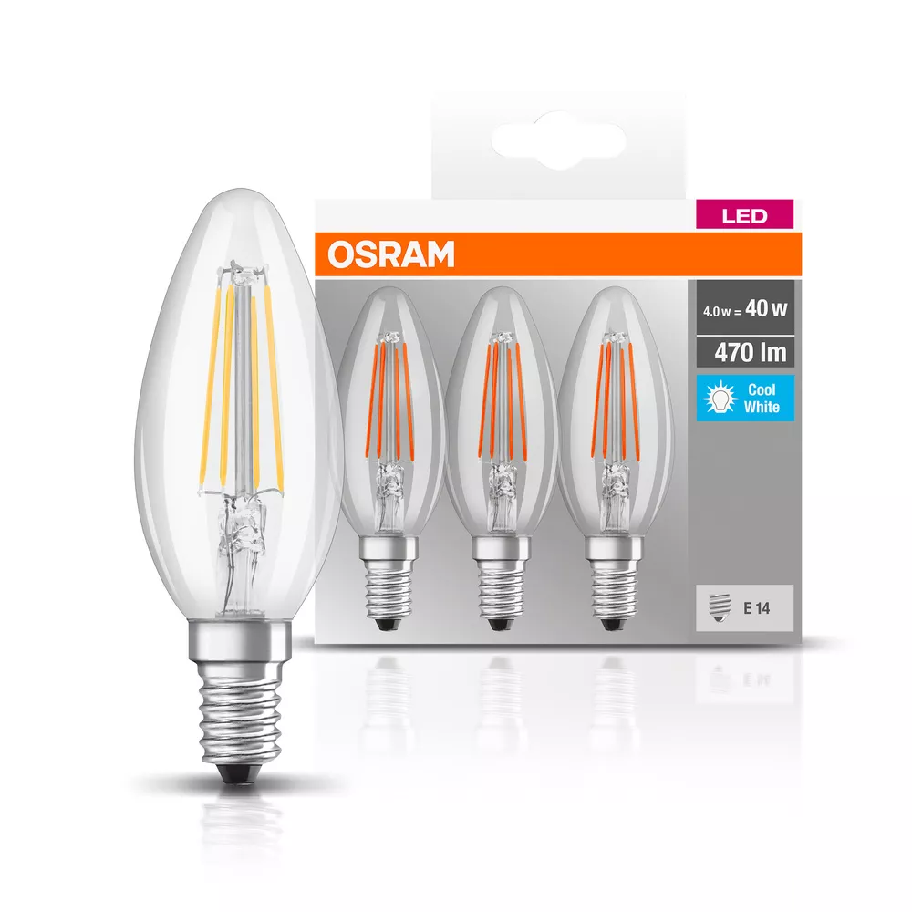 Lampy LED w kształcie klasycznej żarówki świecowej. Cechy produktu: Profesjonalne lampy dla napięcia sieciowego. Nieprzystosowane do pracy z regulatorami. Dobre oddawanie barw (Ra ≥ 80) i stabilność braw przez cały czas eksploatacji lampy. Trzonek: E14, B22d. Lampy niezawierające rtęci. Zalety produktu: Niskie obciążenie cieplne (w porównaniu ze standardowym produktem referencyjnym). Niższe zużycie energii w porównaniu do lamp żarowych lub halogenowych. Odporność na wstrząsy i drgania dzięki technologii LED. Brak promieniowania UV i podczerwonego w wiązce światła. Natychmiast 100 % światła, bez czasu nagrzewania. Bezpośrednio zastępuje zwykłe żarówki. Obszary zastosowań: Oświetlenie ogólne. Zastosowania domowe. Żyrandole. Do użytku na zewnątrz tylko w odpowiednich oprawach zewnętrznych. Porady dotyczące bezpieczeństwa: Nie dotykaj lampy, jeśli jest stłuczona.. Nie wolno używać, jeśli zewnętrzne źródło światła jest uszkodzone..