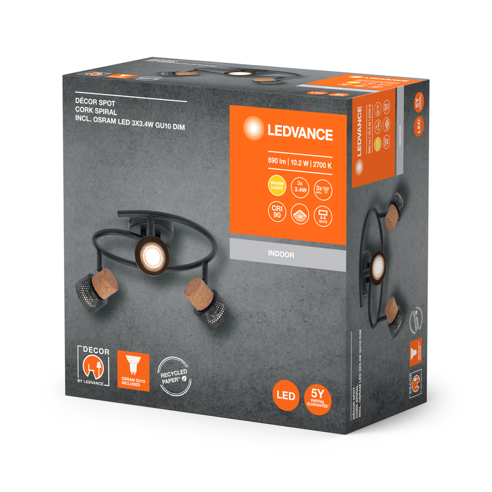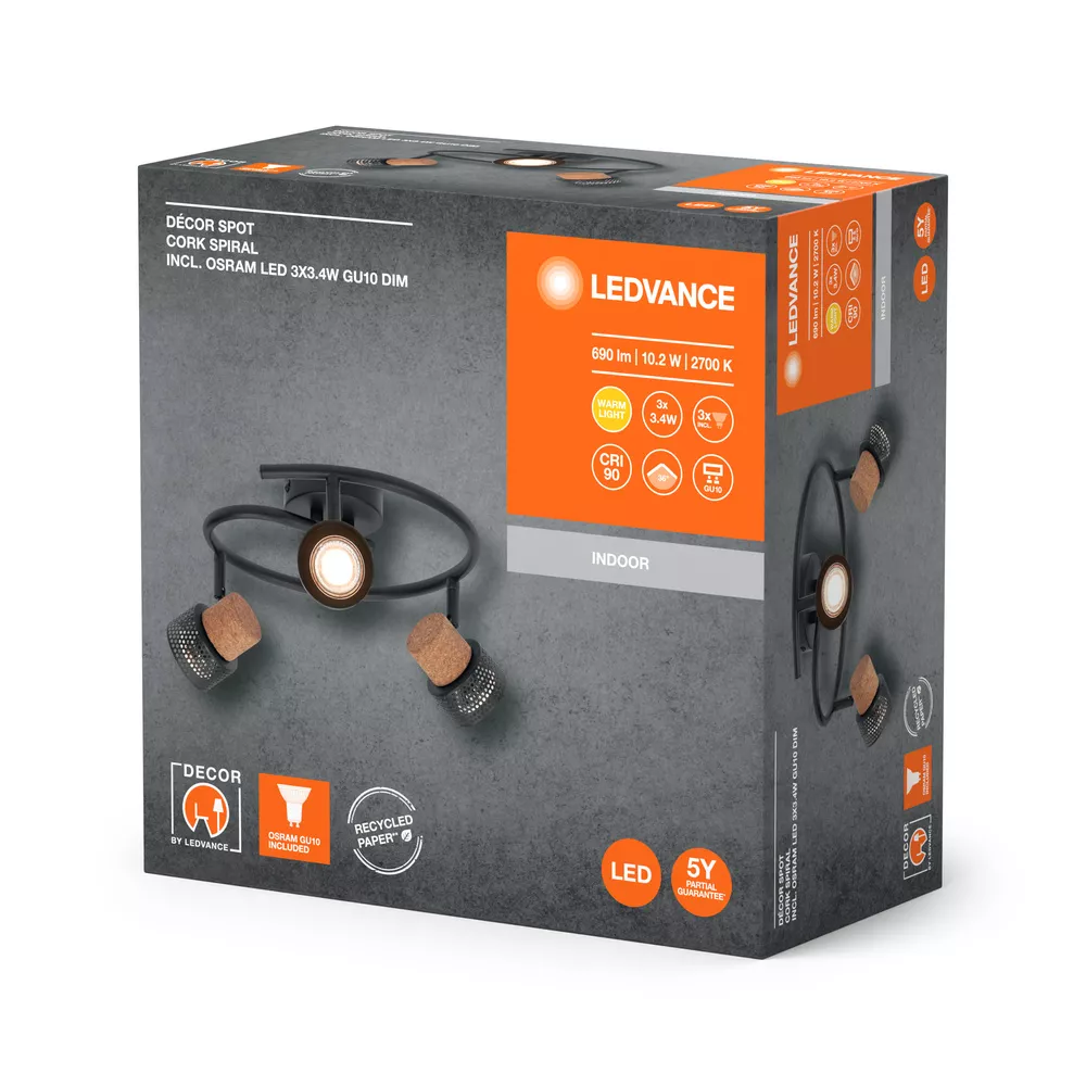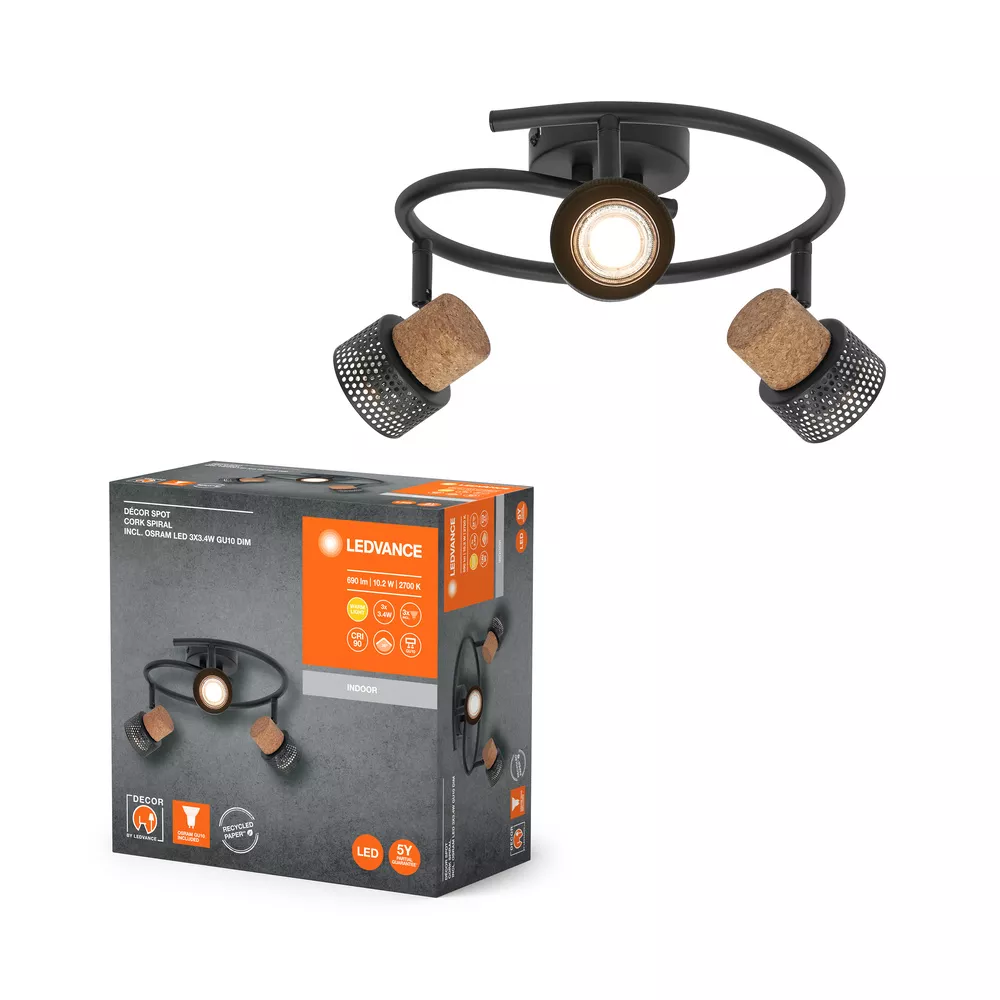 Oprawy sufitowe wykonane z materiałów mieszanych z regulowanymi, ściemnialnymi reflektorami GU10. Cechy produktu: Rodzina opraw obejmuje pięć wersji z maksymalnie 4 głowicami punktowymi. Materiał obudowy: metal i korek. Regulowane oprawy. Zalety produktu: Uniwersalne rozwiązanie dzięki wymiennym lampom LED. Wysokiej jakości obudowa o białej lub czarnej matowej powierzchni. W zestawie ściemniana lampa OSRAM. Łatwy montaż. Obszary zastosowań: Zastosowania wewnętrzne. Korytarze, wejścia, klatki schodowe, pokoje dzienne, sutereny. Kuchnie, przestrzenie robocze. Montaż powierzchniowy na suficie i ścianach. Wyposażenie / Akcesoria: Kompletne akcesoria do montażu i podłączenia w zestawie. Porady dotyczące bezpieczeństwa: Wszystkie podłączenia elektryczne muszą być wykonane przez osobę wykwalifikowaną.. Uwaga, ryzyko porażenia prądem.. Produkt w klasie ochrony I. Wszystkie przewodzące prąd, metalowe części obudowy, które mogą absorbować napięcie podczas pracy lub podczas konserwacji w przypadku awarii, muszą być stale PODŁĄCZONE do przewodu uziemiającego..
