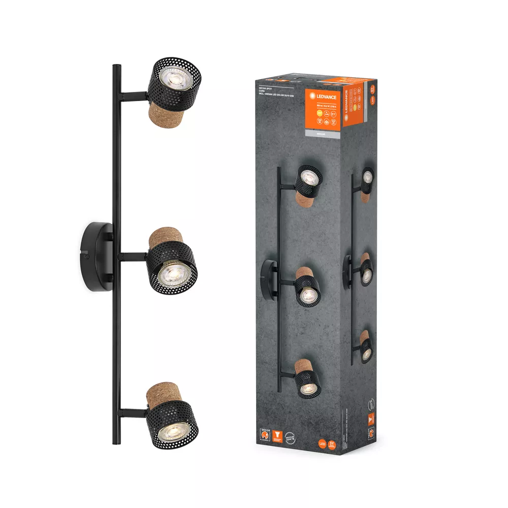 Oprawy sufitowe wykonane z materiałów mieszanych z regulowanymi, ściemnialnymi reflektorami GU10. Cechy produktu: Rodzina opraw obejmuje pięć wersji z maksymalnie 4 głowicami punktowymi. Materiał obudowy: metal i korek. Regulowane oprawy. Zalety produktu: Uniwersalne rozwiązanie dzięki wymiennym lampom LED. Wysokiej jakości obudowa o białej lub czarnej matowej powierzchni. W zestawie ściemniana lampa OSRAM. Łatwy montaż. Obszary zastosowań: Zastosowania wewnętrzne. Korytarze, wejścia, klatki schodowe, pokoje dzienne, sutereny. Kuchnie, przestrzenie robocze. Montaż powierzchniowy na suficie i ścianach. Wyposażenie / Akcesoria: Kompletne akcesoria do montażu i podłączenia w zestawie. Porady dotyczące bezpieczeństwa: Wszystkie podłączenia elektryczne muszą być wykonane przez osobę wykwalifikowaną.. Uwaga, ryzyko porażenia prądem.. Produkt w klasie ochrony I. Wszystkie przewodzące prąd, metalowe części obudowy, które mogą absorbować napięcie podczas pracy lub podczas konserwacji w przypadku awarii, muszą być stale PODŁĄCZONE do przewodu uziemiającego..