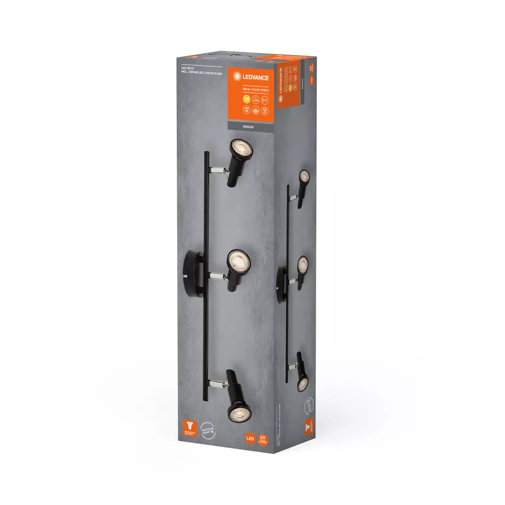 Oprawy sufitowe z regulowanymi, ściemnialnymi reflektorami GU10. Cechy produktu: Rodzina opraw obejmuje pięć wersji z maksymalnie 6 głowicami oświetlenia punktowego. Regulowane oprawy. Zalety produktu: Ponadczasowa stylistyka. Wysokiej jakości obudowa o białej lub czarnej matowej powierzchni. Uniwersalne rozwiązanie dzięki wymiennym lampom LED. W zestawie ściemniana lampa OSRAM. Łatwy montaż. Obszary zastosowań: Zastosowania wewnętrzne. Korytarze, wejścia, klatki schodowe, pokoje dzienne, sutereny. Kuchnie, przestrzenie robocze. Montaż powierzchniowy na suficie i ścianach. Wyposażenie / Akcesoria: Kompletne akcesoria do montażu i podłączenia w zestawie. Porady dotyczące bezpieczeństwa: Wszystkie podłączenia elektryczne muszą być wykonane przez osobę wykwalifikowaną.. Uwaga, ryzyko porażenia prądem.. Produkt w klasie ochrony I. Wszystkie przewodzące prąd, metalowe części obudowy, które mogą absorbować napięcie podczas pracy lub podczas konserwacji w przypadku awarii, muszą być stale PODŁĄCZONE do przewodu uziemiającego..
