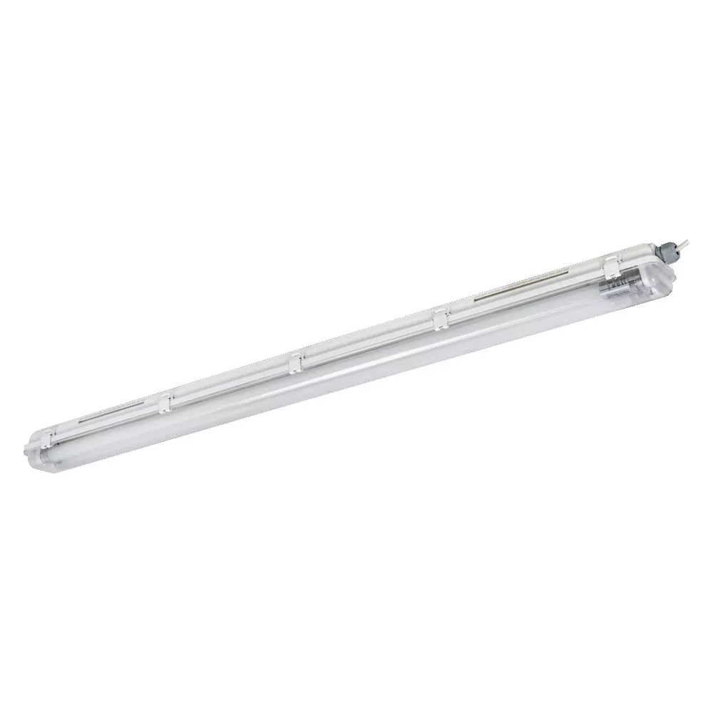 Oprawy odporne na wilgoć. Cechy produktu: Oprawy oświetleniowe odporne na wilgoć wyposażone w tubę LED, zasilane napięciem sieciowym. Trwała i energooszczędna oprawa LED. Zabezpieczenie przed pyłami i wilgocią (IP65). Bez rtęci, zgodne z RoHS. Dławik kablowy M20 do przewodów 8–12 mm. Wykorzystano co najmniej 50% plastiku pochodzącego z recyklingu (w stosunku do całkowitej masy plastiku).. Zalety produktu: Łatwa instalacja dzięki zwiększonej przestrzeni na wsporniki montażowe i łatwej do otwarcia osłonie. Bardzo wysoka klasa efektywności energetycznej D .Tuba LED wykonana ze szkła w celu dalszego ograniczenia stosowania konwencjonalnych, szkodliwych dla środowiska tworzyw sztucznych. Wykonana z tworzyw sztucznych pochodzących z recyklingu lampa przyczynia się do ograniczenia emisji CO2 i ilości odpadów składowanych na wysypiskach. Obszary zastosowań: Sutereny, garaże, magazyny. Eksploatacja tylko w pomieszczeniach. Wyposażenie / Akcesoria: Wraz z produktem dostarczana jest LED TUBE T8 EM P o klasie energetycznej D. Porady dotyczące bezpieczeństwa: Wszystkie podłączenia elektryczne muszą być wykonane przez osobę wykwalifikowaną.. Uwaga, ryzyko porażenia prądem..
