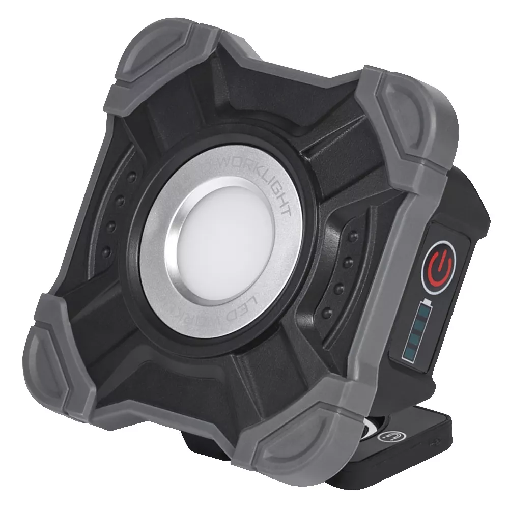 Mobilna lampa robocza zasilana akumulatorem. Cechy produktu: Oprawa robocza z odchylaną głowicą. Przenośna oprawa robocza zasilana bateryjnie. Bateria ładowana poprzez kabel USB. Zalety produktu: Funkcja ładowania przez USB ze zintegrowanej funkcji power banku. Niezależne źródło zasilania dzięki technologii akumulatorowej. Obszary zastosowań: Renowacja. Garaże. Warsztaty. Piwnice. Wyposażenie / Akcesoria: Przewód ładujący USB-C o długości 60 cm. Porady dotyczące bezpieczeństwa: Aby ograniczyć ryzyko uduszenia, elastyczne przewody PODŁĄCZONE do tej oprawy należy solidnie przymocować do ściany, jeśli znajdują się w zasięgu ręki.. Jeśli komora baterii (jeśli dotyczy) nie zamyka się bezpiecznie, zaprzestań używania produktu i trzymaj go z dala od dzieci. Jeśli podejrzewasz, że baterie mogły zostać połknięte lub umieszczone w jakiejkolwiek części ciała, natychmiast zwróć się o pomoc lekarską.. Prosimy unikać: Maksymalna temperatura otoczenia: +35 °C. Wymiana baterii na nieprawidłowy typ, który może obejść zabezpieczenie (na przykład w przypadku niektórych typów baterii litowych). Wysokość podczas pracy: 2000 m. Utylizacja baterii w ogniu lub gorącym piekarniku, lub mechaniczne zgniatanie lub cięcie baterii, co może spowodować wybuch..