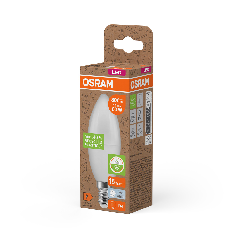 Lampy LED , klasyczna żarówka B z plastiku pochodzącego z recyklingu. Cechy produktu: LED zamienniki tradycyjnych żarówek. Lampy niezawierające rtęci. Wykorzystano co najmniej 40% plastiku pochodzącego z recyklingu (w stosunku do całkowitej masy plastiku).. Zalety produktu: Niższe zużycie energii w porównaniu do lamp żarowych lub halogenowych. Prosty w użyciu zamiennik żarówek klasycznych dzięki kompaktowej konstrukcji. Natychmiast 100 % światła, bez czasu nagrzewania. Wykonana z tworzyw sztucznych pochodzących z recyklingu lampa przyczynia się do ograniczenia emisji CO2 i ilości odpadów składowanych na wysypiskach. Obszary zastosowań: Zastosowania domowe. Oświetlenie ogólne. Do użytku na zewnątrz tylko w odpowiednich oprawach zewnętrznych. Porady dotyczące bezpieczeństwa: Nie dotykaj lampy, jeśli jest stłuczona.. Nie wolno używać, jeśli zewnętrzne źródło światła jest uszkodzone..