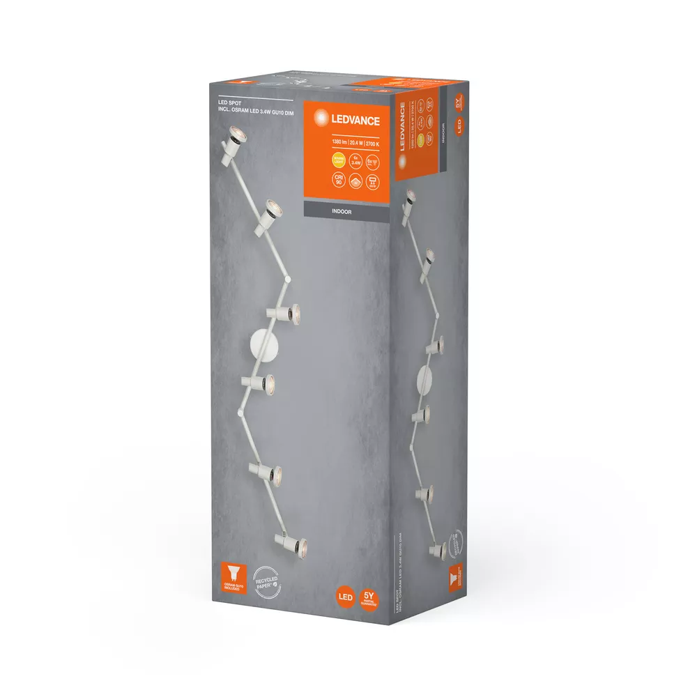 Oprawy sufitowe z regulowanymi, ściemnialnymi reflektorami GU10. Cechy produktu: Rodzina opraw obejmuje pięć wersji z maksymalnie 6 głowicami oświetlenia punktowego. Regulowane oprawy. Zalety produktu: Ponadczasowa stylistyka. Wysokiej jakości obudowa o białej lub czarnej matowej powierzchni. Uniwersalne rozwiązanie dzięki wymiennym lampom LED. W zestawie ściemniana lampa OSRAM. Łatwy montaż. Obszary zastosowań: Zastosowania wewnętrzne. Korytarze, wejścia, klatki schodowe, pokoje dzienne, sutereny. Kuchnie, przestrzenie robocze. Montaż powierzchniowy na suficie i ścianach. Wyposażenie / Akcesoria: Kompletne akcesoria do montażu i podłączenia w zestawie. Porady dotyczące bezpieczeństwa: Wszystkie podłączenia elektryczne muszą być wykonane przez osobę wykwalifikowaną.. Uwaga, ryzyko porażenia prądem.. Produkt w klasie ochrony I. Wszystkie przewodzące prąd, metalowe części obudowy, które mogą absorbować napięcie podczas pracy lub podczas konserwacji w przypadku awarii, muszą być stale PODŁĄCZONE do przewodu uziemiającego..