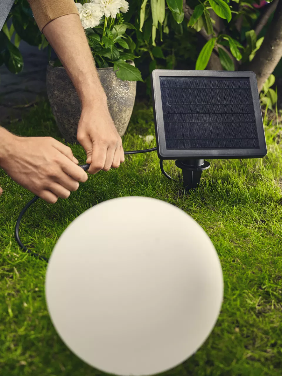 Hybrydowe oprawy z kolcami ziemnymi, które wykorzystują zarówno energię słoneczną, jak i energię z sieci elektrycznej. Cechy produktu: Maksymalne podłączone obciążenie na panel słoneczny = 24 W. Stopień ochrony wtyczek przyłączeniowych IP67. Po podłączeniu do sieci energetycznej oprawa automatycznie przełącza się na zasilanie sieciowe w przypadku wyczerpania się baterii panelu słonecznego. Stopień ochrony opraw IP44. Trwały materiał obudowy. Zalety produktu: Możliwość wykorzystania zarówno energii słonecznej, jak i energii z sieci elektrycznej. Łatwa instalacja i podłączenie elektryczne bez użycia narzędzi, bez fachowej wiedzy, niezależnie od źródła zasilania. Napięcie prądu stałego 12 V zapewnia najwyższe bezpieczeństwo dla ludzi i zwierząt. Dostępne typy produktów dla różnych zastosowań. Różne typy z regulowaną głowicą . Możliwość montażu natynkowego i gruntowego za pomocą kolców. Energia odnawialna. Obszary zastosowań: Ogrody i inne tereny zewnętrzne. Patia, balkony. Oświetlenie awaryjne. Elewacje budynków. Porady dotyczące bezpieczeństwa: Aby ograniczyć ryzyko uduszenia, elastyczne przewody PODŁĄCZONE do tej oprawy należy solidnie przymocować do ściany, jeśli znajdują się w zasięgu ręki..