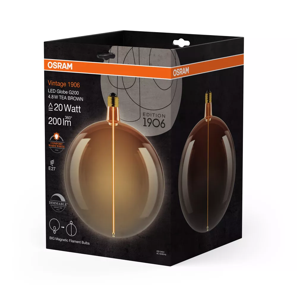 Ściemnialne lampy LED , dekoracyjne z technologią "filament-magnetic". Cechy produktu: Trwałość do 15 000 h. Dobra jakość światła, wskaźnik oddawania barw Ra: ≥ 80; stała chromatyczność. Lampa wykonana z plastiku. Przyjemne światło: ciepłobiała barwa światła. Może być używana bezpośrednio jako oprawa oświetleniowa. Ściemnialne. Zalety produktu: Bardzo niskie zużycie energii. Natychmiast 100 % światła, bez czasu nagrzewania. Łatwy montaż zamiast zwykłych żarówek. Stopień ochrony: IP20, Idealny do użytku w pomieszczeniach zamkniętych. Lampy dekoracyjne wykorzystujące innowacyjną technologię LED „filament-magnetic”.. Brak uchwytu na żarnik: Idealny do instalacji dekoracyjnych. Dostępne różne kształty i średnice baniek. Obszary zastosowań: Doskonałe rozwiązanie do instalacji dekoracyjnych. Zastosowania domowe. Oświetlenie ogólne. Porady dotyczące bezpieczeństwa: Nie dotykaj lampy, jeśli jest stłuczona.. Nie wolno używać, jeśli zewnętrzne źródło światła jest uszkodzone..