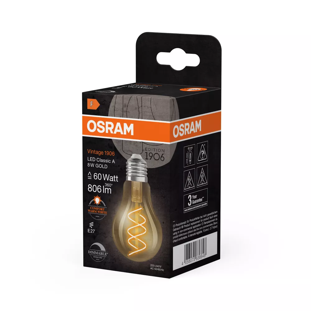 Ściemniane lampy LED , edycja vintage, klasyczne, kształty żarówek świecowych i kulistych. Cechy produktu: Lampy LED dla napięcia sieciowego. Lampa wykonana ze szkła. Trwałość do 15 000 h. Kąt wiązki światła: do 360°. Ściemnialne. Dobra jakość światła, wskaźnik oddawania barw Ra: ≥ 80; stała chromatyczność. Może być używana bezpośrednio jako oprawa oświetleniowa. Cieńsze włókno, lepszy efekt dekoracyjny. Zalety produktu: Niższe zużycie energii w porównaniu do lamp żarowych lub halogenowych. Natychmiast 100 % światła, bez czasu nagrzewania. Łatwy montaż zamiast zwykłych żarówek. Lampy wykorzystujące innowacyjną technologię LED „slim-filament”.. Spiralne cienkie włókno o średnicy φ0,6mm. Prosta, długa, wąska - szerokość włókna: minimum 0,7mm. Obszary zastosowań: Doskonałe rozwiązanie do instalacji dekoracyjnych. Zastosowania domowe. Oświetlenie ogólne. Do użytku na zewnątrz tylko w odpowiednich oprawach zewnętrznych. Porady dotyczące bezpieczeństwa: Nie dotykaj lampy, jeśli jest stłuczona.. Nie wolno używać, jeśli zewnętrzne źródło światła jest uszkodzone..