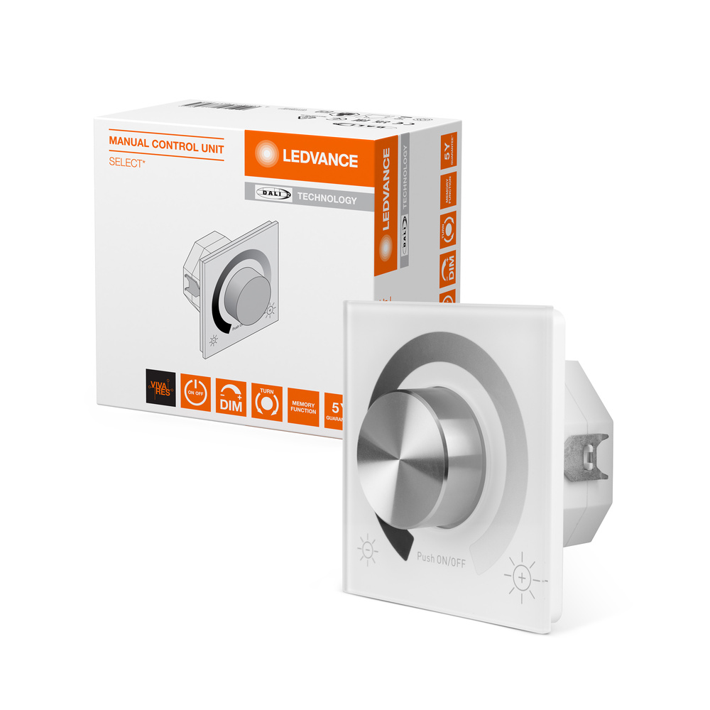 Ręczna jednostka sterująca do 25 lamp. Cechy produktu: Urządzenie sterujące DALI-2 do montażu w standardowych puszkach podtynkowych. Pokrętło do ręcznego sterowania oświetleniem. Można podłączyć równolegle do 4 urządzeń sterujących, aby utworzyć kilka punktów kontrolnych. Automatyczna synchronizacja pomiędzy punktami kontrolnymi. Liczba lamp DALI na jednostkę sterującą: do 25. Długość przewodu sterującego DALI: do 300 m. Zalety produktu: Prosta, intuicyjna obsługa. Ręczne ściemnianie, przełączanie i zapisywanie ustawień oświetlenia. Indywidualna regulacja poziomu jasności. Wysokiej jakości szklana osłona. Można ustawić zachowanie po przerwie w zasilaniu. Praca z zasilaniem sieciowym (tryb aktywny) lub DALI (tryb pasywny). Kompatybilny z systemem sterowania oświetleniem LEDVANCE VIVARES DALI (oprawy LEDVANCE DALI). Obszary zastosowań: Rozwiązanie jednopomieszczeniowe z maksymalnie 4 strefami dostępu. Sale narad i konferencyjne. Restauracje. Oświetlenie sklepowe. Domy prywatne.