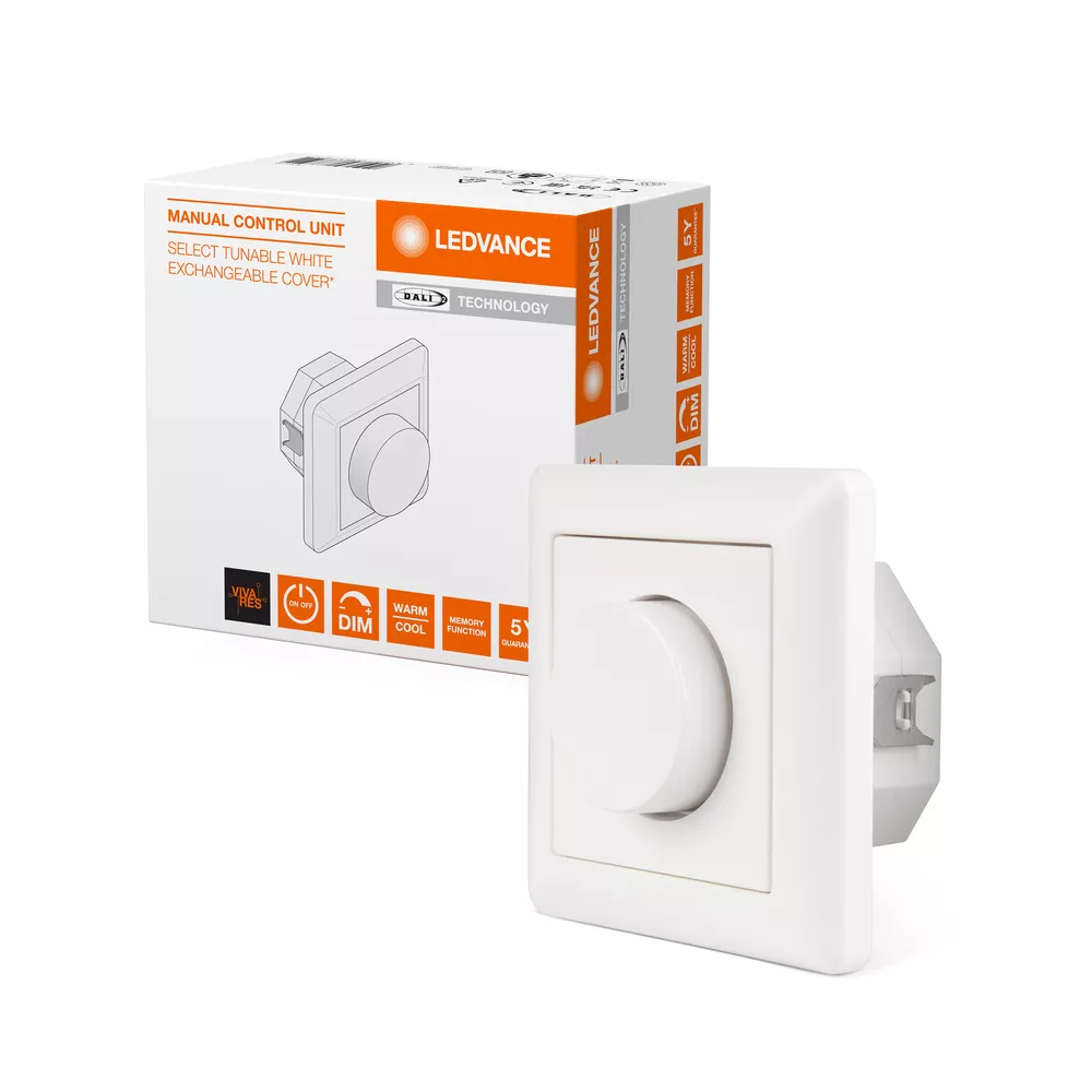 Ręczna jednostka sterująca do 25 lamp, umożliwia oświetlenie Tunable White, wymienna osłona. Cechy produktu: Urządzenie sterujące DALI-2 do montażu w standardowych puszkach podtynkowych. Pokrętło do ręcznego sterowania oświetleniem. Można podłączyć równolegle do 4 urządzeń sterujących, aby utworzyć kilka punktów kontrolnych. Automatyczna synchronizacja pomiędzy punktami kontrolnymi. Liczba lamp DALI na jednostkę sterującą: do 25. Długość przewodu sterującego DALI: do 300 m. Zalety produktu: Prosta, intuicyjna obsługa. Ręczne ściemnianie, przełączanie i zapisywanie ustawień oświetlenia. Indywidualna regulacja poziomu jasności i temperatury barwowej. Wymienna przednia osłona z kompatybilnymi osłonami przycisków świetlnych BUSCH-JÄGER, GIRA, JUNG, SCHNEIDER, BERKER, SIEMENS. Można ustawić zachowanie po przerwie w zasilaniu. Praca z zasilaniem sieciowym (tryb aktywny) lub DALI (tryb pasywny). Dostępna opcjonalna ramka do montażu powierzchniowego. Kompatybilny z systemem sterowania oświetleniem LEDVANCE VIVARES DALI (oprawy LEDVANCE DALI). Obszary zastosowań: Rozwiązanie jednopomieszczeniowe z maksymalnie 4 strefami dostępu. Sale narad i konferencyjne. Restauracje. Oświetlenie sklepowe. Domy prywatne.