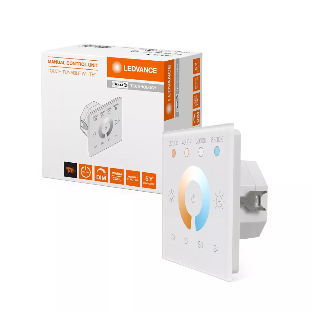 Ręczna jednostka sterująca z wyświetlaczem dotykowym obsługująca do 25 świateł, umożliwia oświetlenie Tunable White. Cechy produktu: Urządzenie sterujące DALI-2 do montażu w standardowych puszkach podtynkowych. Panel dotykowy do ręcznego sterowania oświetleniem. Można podłączyć równolegle do 4 urządzeń sterujących, aby utworzyć kilka punktów kontrolnych. Automatyczna synchronizacja pomiędzy punktami kontrolnymi. Liczba lamp DALI na jednostkę sterującą: do 25. Długość przewodu sterującego DALI: do 300 m. Zalety produktu: Prosta, intuicyjna obsługa. Ręczne ściemnianie, przełączanie i zapisywanie ustawień oświetlenia. Indywidualna regulacja poziomu jasności i temperatury barwowej. Można ustawić zachowanie po przerwie w zasilaniu. Wysokiej jakości szklana osłona. Praca z zasilaniem sieciowym (tryb aktywny) lub DALI (tryb pasywny). Dostępna opcjonalna ramka do montażu powierzchniowego. Kompatybilny z systemem sterowania oświetleniem LEDVANCE VIVARES DALI (oprawy LEDVANCE DALI). Obszary zastosowań: Rozwiązanie jednopomieszczeniowe z maksymalnie 4 strefami dostępu. Sale narad i konferencyjne. Restauracje. Oświetlenie sklepowe. Domy prywatne.