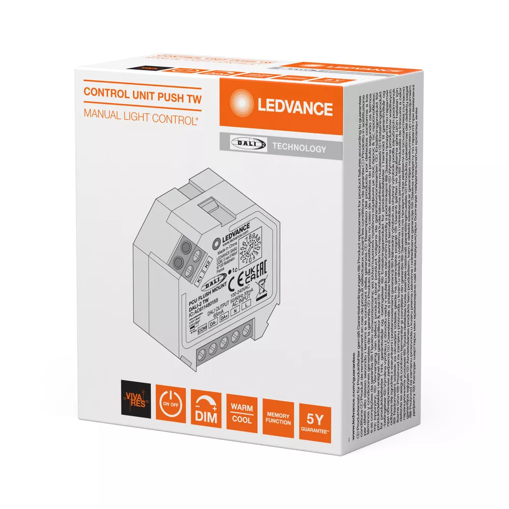 Interfejs DALI-2 do standardowych włączników oświetlenia, montaż w puszce podtynkowej, umożliwia oświetlenie Tunable White. Cechy produktu: Urządzenie sterujące DALI-2 przeznaczone do montażu w standardowych puszkach podtynkowych lub na szynach DIN w szafach rozdzielczych. Można podłączyć równolegle do 4 urządzeń sterujących, aby utworzyć kilka punktów kontrolnych. Automatyczna synchronizacja pomiędzy punktami kontrolnymi. Liczba lamp DALI na jednostkę sterującą: do 25. Długość przewodu sterującego DALI: do 300 m. Zalety produktu: Kompatybilny ze wszystkimi popularnymi konstrukcjami przycisków. Prosta, intuicyjna obsługa. Ręczne ściemnianie, przełączanie i zapisywanie. Indywidualna regulacja poziomu jasności i temperatury barwowej. Zintegrowany zasilacz magistrali DALI (nie wymaga podłączenia do sieci). Można ustawić zachowanie po przerwie w zasilaniu. Łatwa instalacja dzięki wstępnie zmontowanemu przewodowi przyłączeniowemu. Kompatybilny z oprawami DALI-2, paskami LED i lampami LED. Obszary zastosowań: Rozwiązanie jednopomieszczeniowe z maksymalnie 4 strefami dostępu. Sale narad i konferencyjne. Restauracje. Oświetlenie sklepowe. Domy prywatne.
