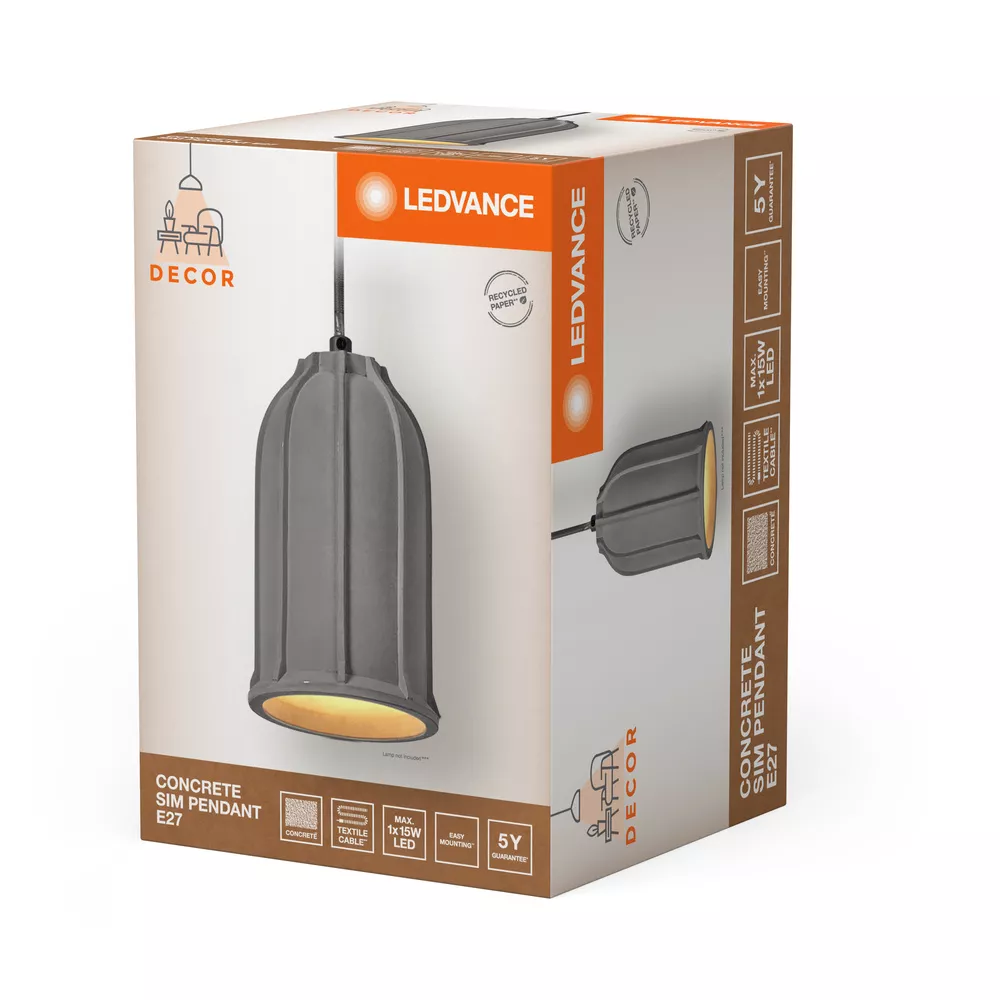 Dekoracyjne oprawy betonowe z oprawką E27. Cechy produktu: Materiał obudowy: metal i beton. Przewód tekstylny. Zalety produktu: Wysoka jakość . Wysoka uniwersalność wyboru źródła światła dzięki trzonkowi E27. Zrównoważone rozwiązanie dzięki wymiennym źródłom światła. Łatwy montaż. Prawdziwe drewno używane przez niektóre typy. Obszary zastosowań: Zastosowania wewnętrzne. Korytarze, wejścia, klatki schodowe, pokoje dzienne, sutereny. Porady dotyczące bezpieczeństwa: Wszystkie podłączenia elektryczne muszą być wykonane przez osobę wykwalifikowaną.. Uwaga, ryzyko porażenia prądem.. Aby ograniczyć ryzyko uduszenia, elastyczne przewody PODŁĄCZONE do tej oprawy należy solidnie przymocować do ściany, jeśli znajdują się w zasięgu ręki..