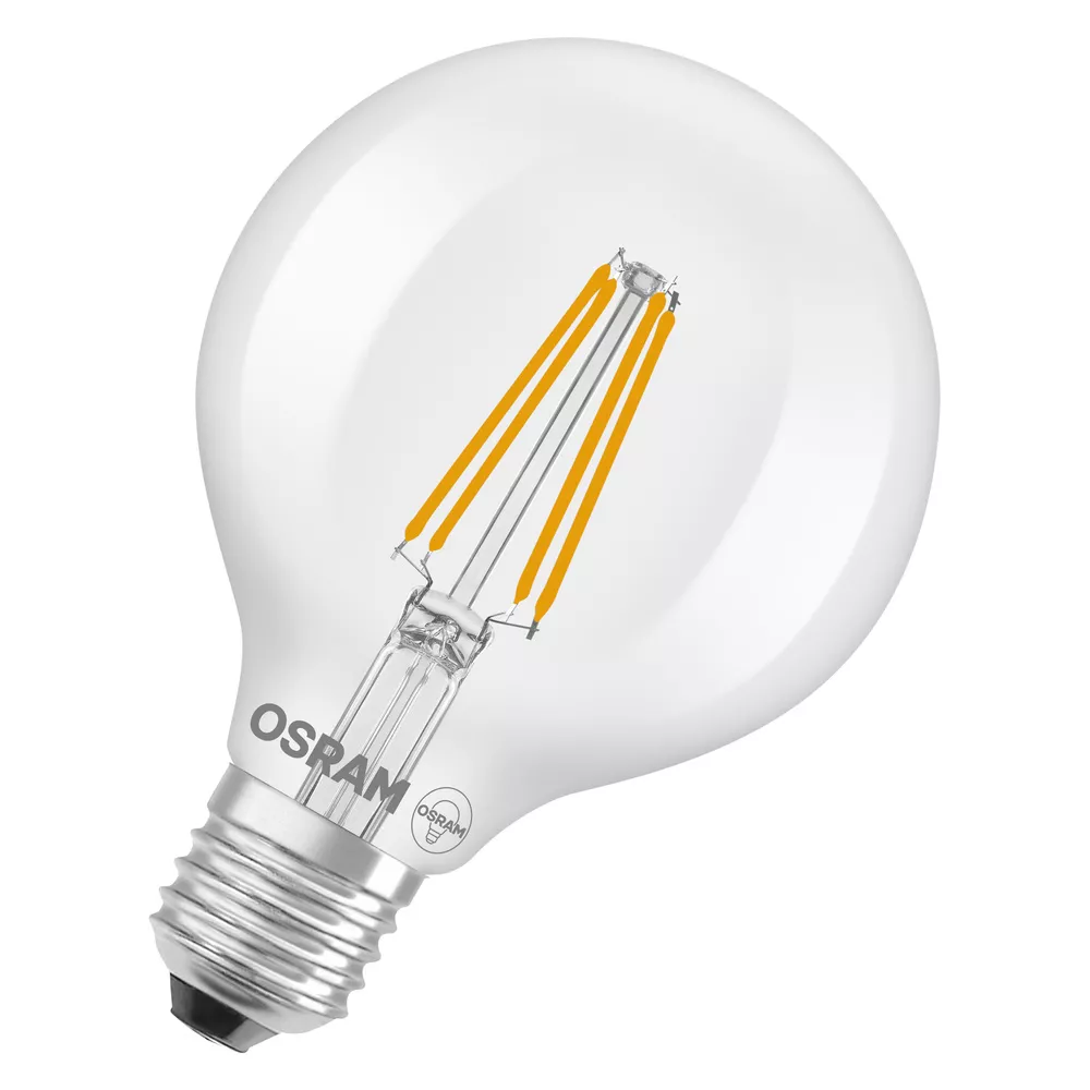 Lampy LED, klasyczny kształt żarówki kulistej, KLASA EFEKTYWNOŚCI ENERGETYCZNEJ A. Cechy produktu: Lampy LED dla napięcia sieciowego. Kąt wiązki światła: do 300°. Długa trwałość do 50 000 godzin. Bardzo duża liczba cykli łączeniowych do 100 000. Skuteczność świetlna do 210 lm/W. Zalety produktu: Lampy wyposażone w innowacyjną technologię „włókien” LED. Wygląd, wymiary i strumień świetlny porównywalne z żarówkami halogenowymi. Niskie zużycie energii. Natychmiast 100 % światła, bez czasu nagrzewania. Niskie tętnienie światła. Obszary zastosowań: Doskonałe rozwiązanie do instalacji dekoracyjnych. Zastosowania domowe. Oświetlenie ogólne. Do użytku na zewnątrz tylko w odpowiednich oprawach zewnętrznych. Porady dotyczące bezpieczeństwa: Nie dotykaj lampy, jeśli jest stłuczona.. Nie wolno używać, jeśli zewnętrzne źródło światła jest uszkodzone..