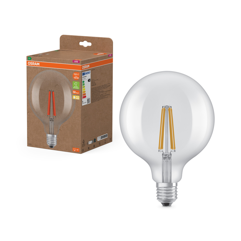 Lampy LED, klasyczny kształt żarówki kulistej, KLASA EFEKTYWNOŚCI ENERGETYCZNEJ A. Cechy produktu: Lampy LED dla napięcia sieciowego. Kąt wiązki światła: do 300°. Długa trwałość do 50 000 godzin. Bardzo duża liczba cykli łączeniowych do 100 000. Skuteczność świetlna do 210 lm/W. Zalety produktu: Lampy wyposażone w innowacyjną technologię „włókien” LED. Wygląd, wymiary i strumień świetlny porównywalne z żarówkami halogenowymi. Niskie zużycie energii. Natychmiast 100 % światła, bez czasu nagrzewania. Niskie tętnienie światła. Obszary zastosowań: Doskonałe rozwiązanie do instalacji dekoracyjnych. Zastosowania domowe. Oświetlenie ogólne. Do użytku na zewnątrz tylko w odpowiednich oprawach zewnętrznych. Porady dotyczące bezpieczeństwa: Nie dotykaj lampy, jeśli jest stłuczona.. Nie wolno używać, jeśli zewnętrzne źródło światła jest uszkodzone..