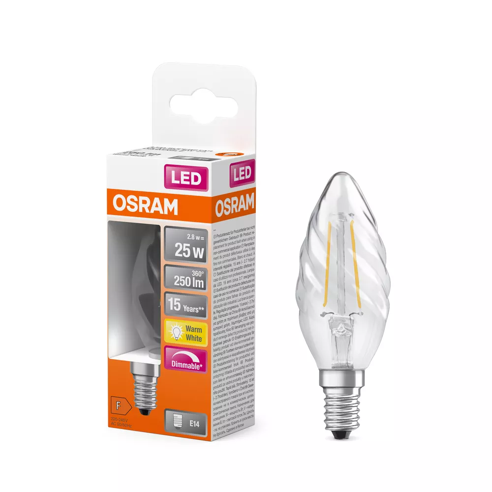 Ściemnialne lampy LED , klasyczny kształt miniświecy. Cechy produktu: Lampy LED dla napięcia sieciowego. Ściemnialne (za pomocą licznych popularnych ściemniaczy, zobacz więcej www.ledvance.pl/dim). Trwałość do 15 000 h. Lampa wykonana ze szkła. Dobra jakość światła, wskaźnik oddawania barw Ra: ≥ 80; stała chromatyczność. Ściemnialne. Zalety produktu: Lampy wyposażone w innowacyjną technologię „włókien” LED. Niższe zużycie energii w porównaniu do lamp żarowych lub halogenowych. Natychmiast 100 % światła, bez czasu nagrzewania. Łatwy montaż zamiast zwykłych żarówek. Wygląd, wymiary i strumień świetlny porównywalne z żarówkami halogenowymi. Obszary zastosowań: Doskonałe rozwiązanie do instalacji dekoracyjnych. Zastosowania domowe. Oświetlenie ogólne. Do użytku na zewnątrz tylko w odpowiednich oprawach zewnętrznych. Porady dotyczące bezpieczeństwa: Nie dotykaj lampy, jeśli jest stłuczona.. Nie wolno używać, jeśli zewnętrzne źródło światła jest uszkodzone..