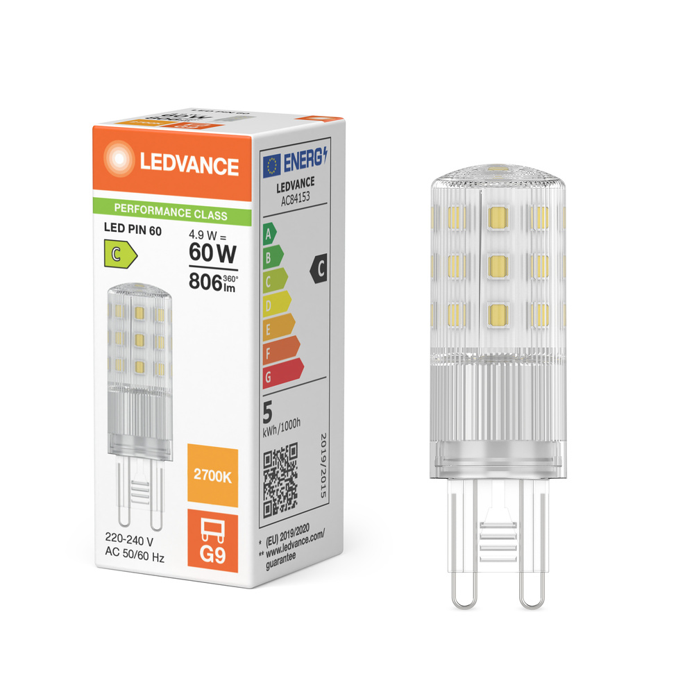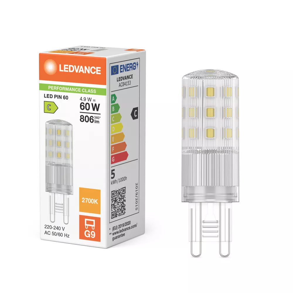 Lampy LED z trzonkiem G9. Cechy produktu: Zamienniki LED dla konwencjonalnych żarówek wysokonapięciowych. Dobra jakość światła, wskaźnik oddawania barw Ra: ≥ 80; stała chromatyczność. Zalety produktu: Równomierny rozsył światła we wszystkich kierunkach. Długa trwałość do 15 000 godzin. 4-letnia gwarancja. Niższe zużycie energii w porównaniu do lamp żarowych lub halogenowych. Obszary zastosowań: Nastrojowe oświetlenie akcentujące w całym domu. Sklepy, hotele i restauracje. Do użytku na zewnątrz tylko w odpowiednich oprawach zewnętrznych. Porady dotyczące bezpieczeństwa: Nie dotykaj lampy, jeśli jest stłuczona.. Nie wolno używać, jeśli zewnętrzne źródło światła jest uszkodzone.. Aby zapewnić pełną wydajność oświetlenia i trwałość produktu, zalecane jest demontaż szyby lub osłony oprawy oświetleniowej..
