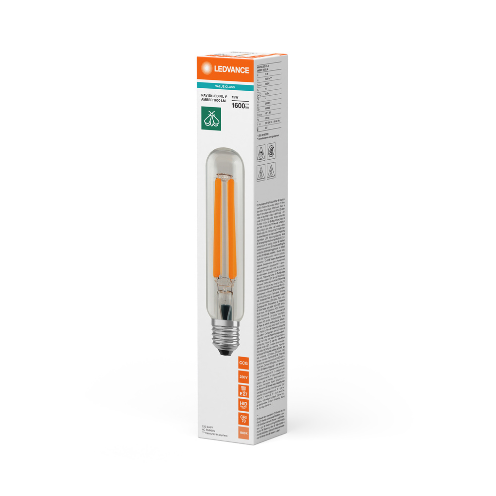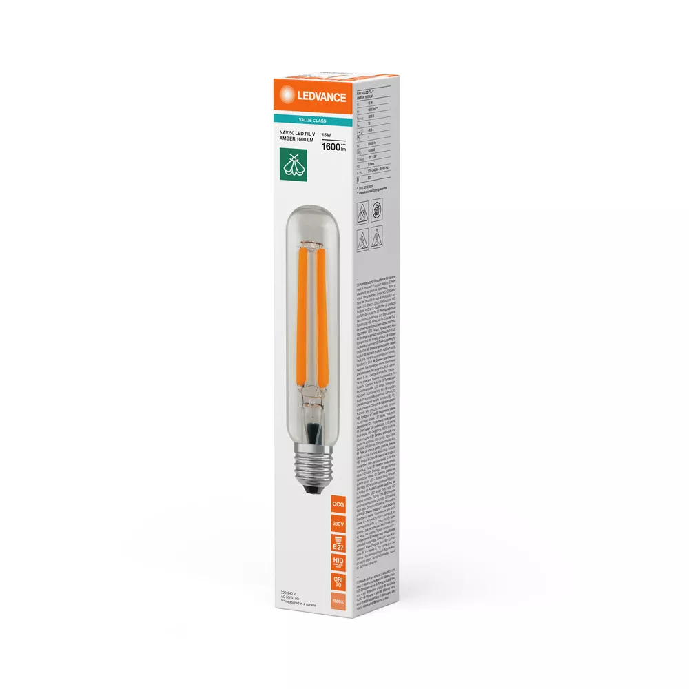 Zamiennik LED dla lamp NAV w zastosowaniach zewnętrznych zorientowanych na design, ze zmniejszoną zawartością światła niebieskiego. Cechy produktu: Mniej niż 1,5% światła niebieskiego (< 500 nm). Ciepłobiała barwa światła Tc=1800 K podobna do barwy światła tradycyjnych lamp sodowych (NAV). Nadaje się do pracy z konwencjonalnym układem zasilającym lub zasilanie bezpośrednie 230 V AC. Współczynnik mocy: 0,9. Stopień ochrony: IP65. Zabezpieczenie przeciwprzepięciowe: do 2 kV (L-N). Zalety produktu: Wspieraj ochronę dzikiej przyrody dzięki bardzo niskiemu procentowi światła niebieskiego. Wspomaga redukcję zakłóceń rytmu okołodobowego i poprawia jakość życia mieszkańców. Lepsze oddawanie barw i lepsza widoczność w porównaniu z tradycyjnymi lampami sodowymi (NAV). Taki sam wygląd jak tradycyjne lampy NAV z cylindryczną szklaną bańką . Pełne wykorzystanie odbłyśnika w istniejącej oprawie oświetleniowej dzięki kątowi świecenia 360 stopni. Oszczędza do 70% energii, gdy jest używany jako zamiennik lamp sodowych (NAV). Natychmiast 100 % światła, bez czasu nagrzewania. Podobny rozsył strumienia świetlnego do rozsyłu strumienia świetlnego lamp sodowych NAV. Obszary zastosowań: Oświetlenie uliczne i zewnętrzne. Tereny bliskie naturze. Tereny mieszkalne. Parki. Budynki i dzielnice historyczne. Zastosowania zewnętrzne - tylko w odpowiednich oprawach. Porady dotyczące bezpieczeństwa: Nie nadaje się do pracy z zapłonnikami.. Zastosowanie kondensatora może doprowadzić do obniżenia współczynnika mocy systemu.. W przypadku montażu poziomego punkt t<sub>c</sub> lampy powinien znajdować się w górnej części lampy.. Prawidłowa praca w temperaturze otoczenia do 50 °C wewnątrz oprawy. Nie zaleca się stosowania w małych oprawach i oprawach z małymi odbłyśnikami.. Wszystkie podłączenia elektryczne muszą być wykonane przez osobę wykwalifikowaną.. Nie jest przeznaczony do zastępowania tradycyjnego oświetlenia w gospodarstwach domowych.. Nie dotykaj lampy, jeśli jest stłuczona..