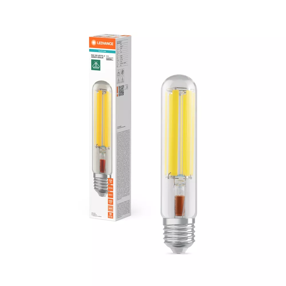 Zamiennik LED dla lamp NAV w zastosowaniach zewnętrznych zorientowanych na design, ze zmniejszoną zawartością światła niebieskiego. Cechy produktu: Mniej niż 1,5% światła niebieskiego (< 500 nm). Ciepłobiała barwa światła Tc=1800 K podobna do barwy światła tradycyjnych lamp sodowych (NAV). Nadaje się do pracy z konwencjonalnym układem zasilającym lub zasilanie bezpośrednie 230 V AC. Współczynnik mocy: 0,9. Stopień ochrony: IP65. Zabezpieczenie przeciwprzepięciowe: do 2 kV (L-N). Zalety produktu: Wspieraj ochronę dzikiej przyrody dzięki bardzo niskiemu procentowi światła niebieskiego. Wspomaga redukcję zakłóceń rytmu okołodobowego i poprawia jakość życia mieszkańców. Lepsze oddawanie barw i lepsza widoczność w porównaniu z tradycyjnymi lampami sodowymi (NAV). Taki sam wygląd jak tradycyjne lampy NAV z cylindryczną szklaną bańką . Pełne wykorzystanie odbłyśnika w istniejącej oprawie oświetleniowej dzięki kątowi świecenia 360 stopni. Oszczędza do 70% energii, gdy jest używany jako zamiennik lamp sodowych (NAV). Natychmiast 100 % światła, bez czasu nagrzewania. Podobny rozsył strumienia świetlnego do rozsyłu strumienia świetlnego lamp sodowych NAV. Obszary zastosowań: Oświetlenie uliczne i zewnętrzne. Tereny bliskie naturze. Tereny mieszkalne. Parki. Budynki i dzielnice historyczne. Zastosowania zewnętrzne - tylko w odpowiednich oprawach. Porady dotyczące bezpieczeństwa: Nie nadaje się do pracy z zapłonnikami.. Zastosowanie kondensatora może doprowadzić do obniżenia współczynnika mocy systemu.. W przypadku montażu poziomego punkt tc lampy powinien znajdować się w górnej części lampy.. Prawidłowa praca w temperaturze otoczenia do 50 °C wewnątrz oprawy. Nie zaleca się stosowania w małych oprawach i oprawach z małymi odbłyśnikami.. Wszystkie podłączenia elektryczne muszą być wykonane przez osobę wykwalifikowaną.. Nie jest przeznaczony do zastępowania tradycyjnego oświetlenia w gospodarstwach domowych.. Nie dotykaj lampy, jeśli jest stłuczona..