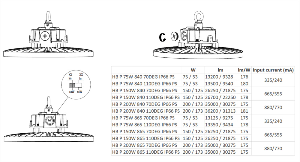Oprawy High-bay o skuteczności świetlnej do 181 lm/W i niskim wskaźniku UGR. Cechy produktu: Funkcja Multi Lumen: możliwość wyboru stopni mocy. Różny strumień świetlny i kąt rozsyłu światła dla wysokości montażu od ~ 6 m do 18 m w temperaturze barwowej światła 4000 K lub 6500 K. Możliwość ściemniania 0-10 V. Trwałość (L80/B10): do 100 000 h (przy 35°C). Zalety produktu: Wysoka wszechstronność dzięki wybieranym stopniom mocy (Multi Lumen) na obudowie. Poprawiona wartość UGR w porównaniu do poprzednich generacji, aż do UGR ≤ 19 (<150W, 70°) w połączeniu z odbłyśnikiem. Wysoka skuteczność świetlna. Oszczędność energii do 70% w porównaniu z konwencjonalnymi oprawami oświetleniowymi typu high bay. Zoptymalizowana masa i rozmiary dzięki kompaktowej konstrukcji. Obszary zastosowań: Bezpośredni zamiennik opraw oświetleniowych typu High Bay do lamp rtęciowych lub metalohalogenkowych. Magazyny, hale logistyczne. Przemysł. Wysokie pomieszczenia (np.: centra handlowe, lotniska, budynki komercyjne, hole). Wyposażenie / Akcesoria: Zaczep do montażu w zestawie. Uchwyty montażowe, odbłyśniki i refraktory dostępne jako oddzielne akcesoria.