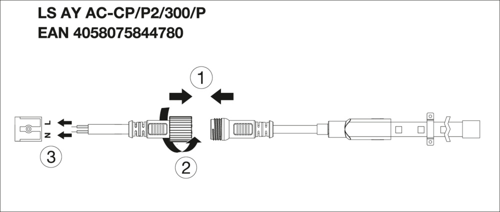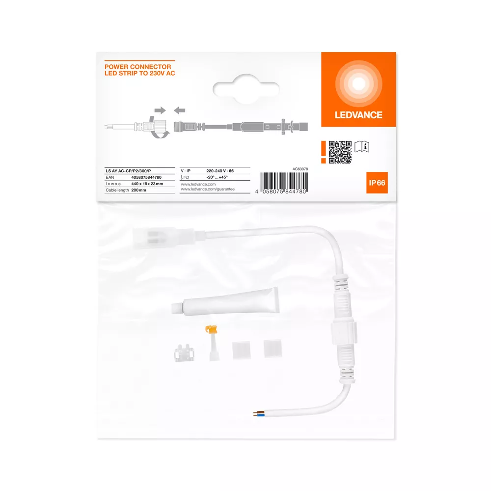 Złącze taśmy LED do zasilania sieciowego AC. Cechy produktu: Bezpieczne i profesjonalne złącze pasków LED do zasilania sieciowego 220-240V AC poprzez okablowane zintegrowane zabezpieczenie nadprądowe (3,15A). Stopień ochrony: IP66. Zalety produktu: Łatwa instalacja złącza, bez konieczności ręcznego łączenia przewodów. Prosty i szybki montaż dzięki funkcji blokady obrotowej. Obszary zastosowań: Ogólne oświetlenie wnętrz. Ogólne oświetlenie zewnętrzne.