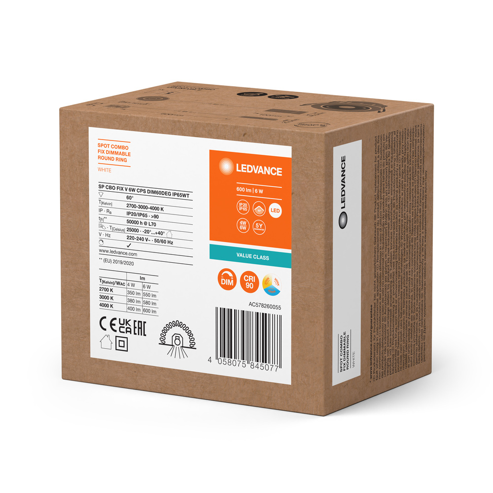 Zasłaniany punkt z CCT, wyborem mocy i funkcją ściemniania, w wersji stałej. Cechy produktu: Przełącznik temperatury barwowej (CCT): 2700 K, 3000 K, 4000 K. Dostępna opcja wyboru mocy do wyboru między dwoma wartościami strumienia świetlnego. Stopień ochrony: IP65 (od strony pomieszczenia). Materiał obudowy: poliwęglany (PC). Ściemnialne (za pomocą licznych popularnych ściemniaczy, zobacz więcej <a href="http://www.ledvance.pl/dim">www.ledvance.pl/dim</a>). Zalety produktu: Regulacja temperatury barwowej za pomocą przełącznika z tyłu reflektora. Wybór mocy: Regulacja jasności (strumienia świetlnego) za pomocą przełącznika na sterowniku. Możliwość pokrycia większością materiałów izolacyjnych. Obszary zastosowań: Bezpośredni zamiennik halogenowych opraw reflektorowych. Oświetlenie ogólne. Pokoje hotelowe i korytarze. Bary, restauracje. Pomieszczenia mieszkalne. Wyposażenie / Akcesoria: Już wyposażony w biały okrągły pierścień. Dodatkowe pierścienie maskujące dostępne oddzielnie w kształcie okrągłym i kwadratowym oraz w różnych kolorach.