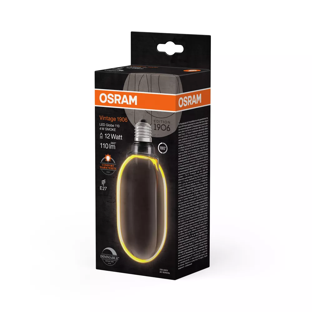 Ściemnialne lampy LED , klasyczna kula w stylu Vintage . Cechy produktu: Możliwość regulacji strumienia świetlnego (za pomocą wielu popularnych ściemniaczy, patrz również www.osram-lamps.com/dim). Przyjemne światło: ciepłobiała barwa światła. Trwałość: do 25 000 h. Kąt obrotu głowicy oprawy oświetleniowej: 180°. Może być używana bezpośrednio jako oprawa oświetleniowa. Zalety produktu: Lampy wyposażone w innowacyjną technologię „włókien” LED. Natychmiast 100 % światła, bez czasu nagrzewania. Stopień ochrony: IP20, Idealny do użytku w pomieszczeniach zamkniętych. Obszary zastosowań: Doskonałe rozwiązanie do instalacji dekoracyjnych. Zastosowania domowe. Do użytku na zewnątrz tylko w odpowiednich oprawach zewnętrznych. Porady dotyczące bezpieczeństwa: Nie dotykaj lampy, jeśli jest stłuczona.. Nie wolno używać, jeśli zewnętrzne źródło światła jest uszkodzone..