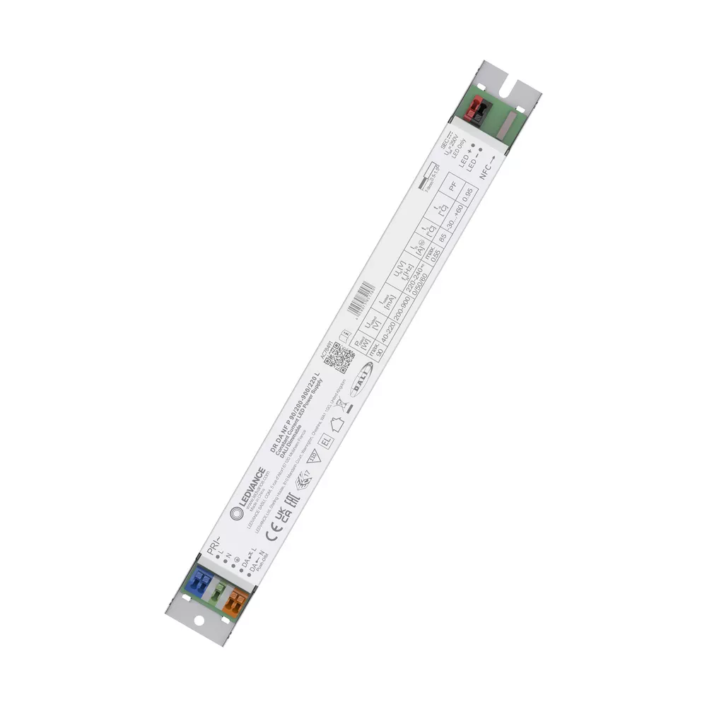 LINEAR zasilacz LED DALI z interfejsem NFC. Cechy produktu: Jednokanałowy sterownik LED, sterowanie DALI-2. Szybkie i łatwe ustawianie prądu za pomocą NFC. Dostępne z zakresem prądu wyjściowego: od 50...1100 mA. Bardzo długa żywotność: do 100 000 godzin. Stały strumień świetlny (CLO). Kompatybilny z Zhaga Book 13. Nadaje się do opraw oświetlenia awaryjnego zgodnie z normą EN 60598-2-2 ze współczynnikiem mocy awaryjnej EOFI (regulowanym za pomocą NFC). Zalety produktu: Certyfikat DALI-2 obejmujący części 251, 252, 253. W pełni programowalny poprzez NFC. Aplikacja Push DIM umożliwia łatwe sterowanie. Wysoka skuteczność świetlna. Moduł LED wymienny i nowatorski dzięki zgodności z normami Zhaga. Wysokiej jakości regulacja mocy w zakresie 1…100 %. Dostępne w wersjach 26 W, 42 W, 60 W, 90 W i 150 W. Obszary zastosowań: Odpowiednie do opraw oświetleniowych i modułów LED. Dotyczy opraw o I klasie ochronności. Nadaje się do instalacji wewnętrznych bez SELV. Przeznaczone dla instalacji awaryjnych. Oświetlenie liniowe do pomieszczeń biurowych, edukacyjnych, magazynowych i handlowych. Porady dotyczące bezpieczeństwa: Wszystkie podłączenia elektryczne muszą być wykonane przez osobę wykwalifikowaną.. Uwaga, ryzyko porażenia prądem.. Przed instalacją należy odłączyć zasilanie.. Nie otwierać obudowy..