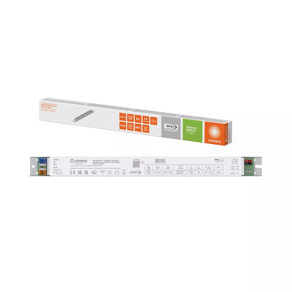 LINEAR zasilacz LED DALI z interfejsem NFC. Cechy produktu: Jednokanałowy sterownik LED, sterowanie DALI-2. Szybkie i łatwe ustawianie prądu za pomocą NFC. Dostępne z zakresem prądu wyjściowego: od 50...1100 mA. Bardzo długa żywotność: do 100 000 godzin. Stały strumień świetlny (CLO). Kompatybilny z Zhaga Book 13. Nadaje się do opraw oświetlenia awaryjnego zgodnie z normą EN 60598-2-2 ze współczynnikiem mocy awaryjnej EOFI (regulowanym za pomocą NFC). Zalety produktu: Certyfikat DALI-2 obejmujący części 251, 252, 253. W pełni programowalny poprzez NFC. Aplikacja Push DIM umożliwia łatwe sterowanie. Wysoka skuteczność świetlna. Moduł LED wymienny i nowatorski dzięki zgodności z normami Zhaga. Wysokiej jakości regulacja mocy w zakresie 1…100 %. Dostępne w wersjach 26 W, 42 W, 60 W, 90 W i 150 W. Obszary zastosowań: Odpowiednie do opraw oświetleniowych i modułów LED. Dotyczy opraw o I klasie ochronności. Nadaje się do instalacji wewnętrznych bez SELV. Przeznaczone dla instalacji awaryjnych. Oświetlenie liniowe do pomieszczeń biurowych, edukacyjnych, magazynowych i handlowych. Porady dotyczące bezpieczeństwa: Wszystkie podłączenia elektryczne muszą być wykonane przez osobę wykwalifikowaną.. Uwaga, ryzyko porażenia prądem.. Przed instalacją należy odłączyć zasilanie.. Nie otwierać obudowy..