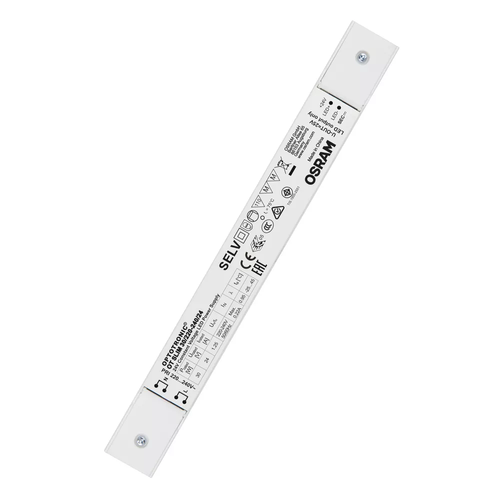 Zasilacze stałonapięciowe 24 V. Zalety produktu: Wszechstronne zastosowanie ze względu zakres mocy aż do 240 W. Bardzo wysoka skuteczność i niezawodność. Stały strumień świetlny przy bardzo niskich i wysokich temperaturach ze względu na inteligentne zasilanie (ang. Smart Power Supply). Obszary zastosowań: Nadaje się do instalacji wewnętrznych i zewnętrznych z SELV. Zastosowanie na zewnątrz wyłącznie w odpowiednich oprawach oświetleniowych. Nadaje się do użytku w wąskich, płaskich oprawach lub instalacjach w podwieszanych sufitach.
