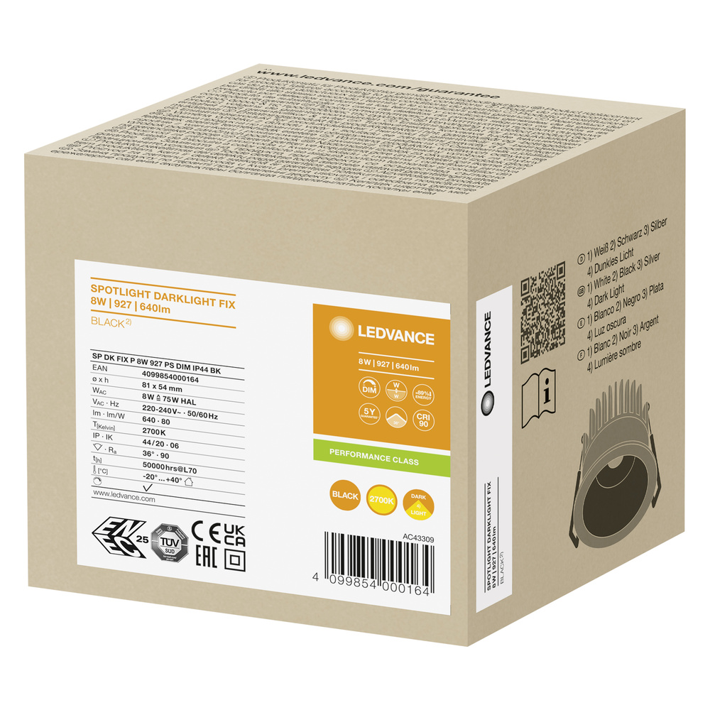 Oprawa punktowa (Spot) z ograniczeniem efektu olśnienia UGR<19, stała. Cechy produktu: Wskaźnik oddawania barw Ra: 90. Stopień ochrony: IP44 (od strony pomieszczenia). Obudowa z odlewu ciśnieniowego aluminium. Sprężyny zabezpieczone podkładkami silikonowymi. Ściemnialne (za pomocą licznych popularnych ściemniaczy, zobacz więcej www.ledvance.pl/dim). Możliwość wykorzystania wewnętrznego okablowania. Zalety produktu: Darklight: Specjalna konstrukcja zapewniająca większy komfort przy niskim olśnieniu. Wyjątkowo małe wymiary ramki. Powerselect: Regulacja mocy za pomocą przełączników DIP na sterowniku. Łatwa wymiana zewnętrznego zasilacza dzięki wtyczce z zatrzaskiem bagnetowym. Łatwa instalacja i podłączenie elektryczne dzięki beznarzędziowym złączom elektrycznym. SCALE Design – świetny wygląd, wysokiej jakości materiały i niewielkie wymiary wpasowują się w każde otoczenie. 5-letnia gwarancja. Obszary zastosowań: Bezpośredni zamiennik halogenowych opraw reflektorowych. Oświetlenie ogólne. Pokoje hotelowe i korytarze. Bary, restauracje. Oświetlenie akcentujące. Galerie, muzea. Pomieszczenia mieszkalne. Wyposażenie / Akcesoria: Zewnętrzny osprzęt sterujący w zestawie z przełącznikami DIP do wyboru mocy podczas instalacji. Pierścienie są dostępne jako akcesoria. Wybrany sterownik DALI 2.0 dostępny jako wyposażenie dodatkowe. Porady dotyczące bezpieczeństwa: Wszystkie podłączenia elektryczne muszą być wykonane przez osobę wykwalifikowaną.. Uwaga, ryzyko porażenia prądem.. Oprawy nie nadają się do pokrywania materiałem termoizolacyjnym..