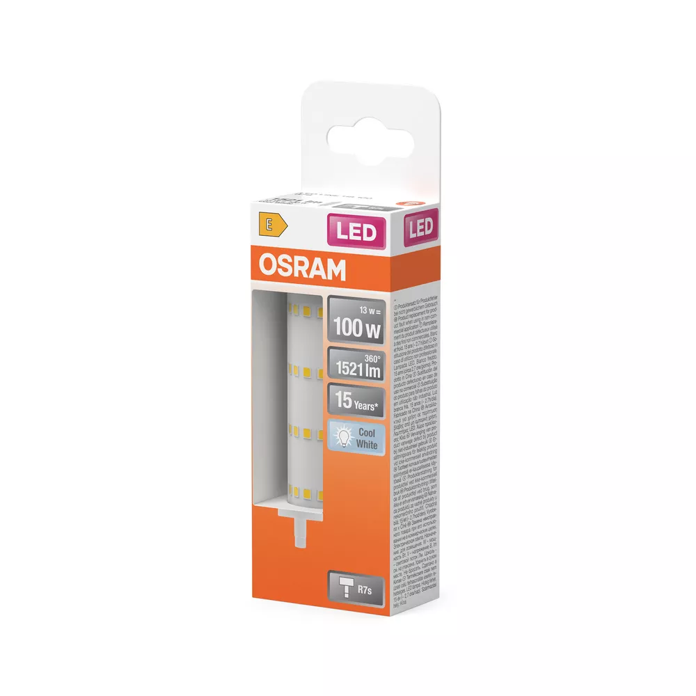 Lampy LED z trzonkiem R7s. Cechy produktu: LED zamiennik żarówek z trzonkiem R7s. Dobra jakość światła, wskaźnik oddawania barw R<sub>a</sub>: ≥ 80; stała chromatyczność. Zalety produktu: Dopasowane do większości opraw oświetleniowych R7 dzięki mimośrodowemu typowi trzonka. Równomierny rozsył światła we wszystkich kierunkach. Niskie obciążenie cieplne (w porównaniu ze standardowym produktem referencyjnym). Długa trwałość do 15 000 godzin. 3-letnia gwarancja. Niższe zużycie energii w porównaniu do lamp żarowych lub halogenowych. Obszary zastosowań: Oświetlenie ogólne w miejscach o temperaturach otoczenia od -20 do +40 °C. Do użytku na zewnątrz tylko w odpowiednich oprawach zewnętrznych. Porady dotyczące bezpieczeństwa: Nie dotykaj lampy, jeśli jest stłuczona.. Nie wolno używać, jeśli zewnętrzne źródło światła jest uszkodzone.. Aby zapewnić pełną wydajność oświetlenia i trwałość produktu, zalecane jest demontaż szyby lub osłony oprawy oświetleniowej..