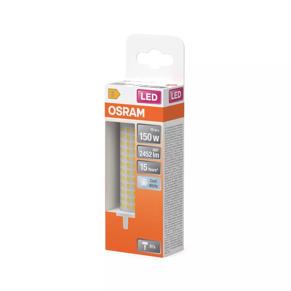 Lampy LED z trzonkiem R7s. Cechy produktu: LED zamiennik żarówek z trzonkiem R7s. Dobra jakość światła, wskaźnik oddawania barw R<sub>a</sub>: ≥ 80; stała chromatyczność. Zalety produktu: Dopasowane do większości opraw oświetleniowych R7 dzięki mimośrodowemu typowi trzonka. Równomierny rozsył światła we wszystkich kierunkach. Niskie obciążenie cieplne (w porównaniu ze standardowym produktem referencyjnym). Długa trwałość do 15 000 godzin. 3-letnia gwarancja. Niższe zużycie energii w porównaniu do lamp żarowych lub halogenowych. Obszary zastosowań: Oświetlenie ogólne w miejscach o temperaturach otoczenia od -20 do +40 °C. Do użytku na zewnątrz tylko w odpowiednich oprawach zewnętrznych. Porady dotyczące bezpieczeństwa: Nie dotykaj lampy, jeśli jest stłuczona.. Nie wolno używać, jeśli zewnętrzne źródło światła jest uszkodzone.. Aby zapewnić pełną wydajność oświetlenia i trwałość produktu, zalecane jest demontaż szyby lub osłony oprawy oświetleniowej..