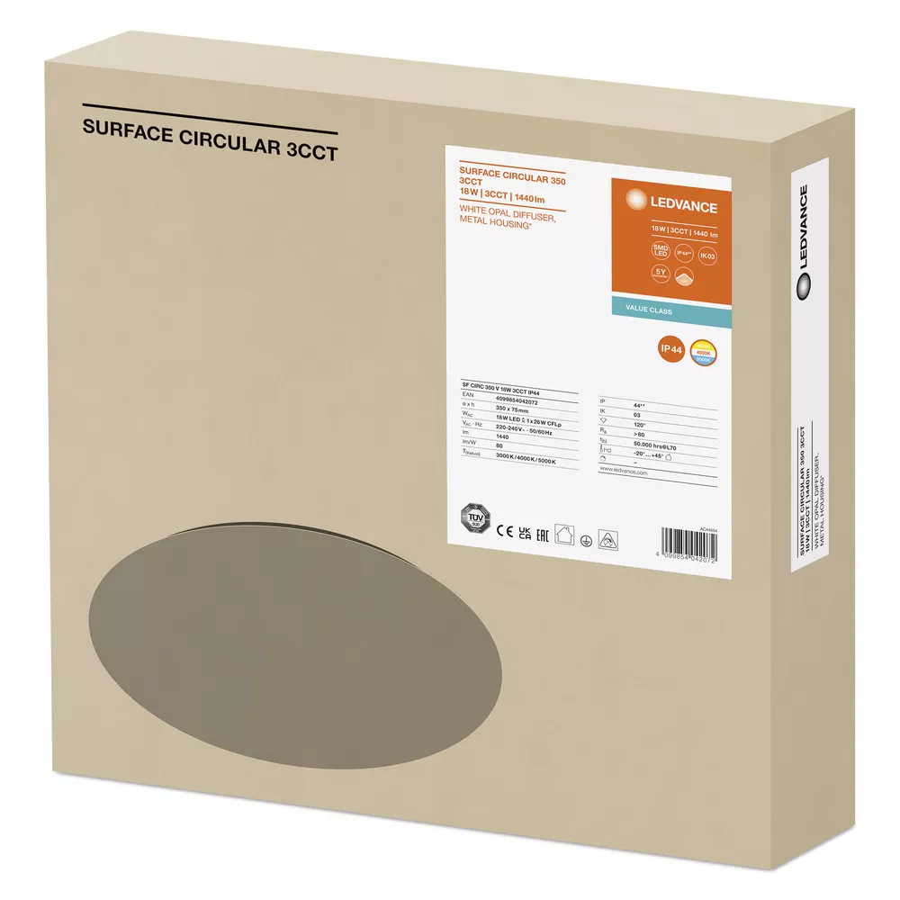 Oprawa ścienna i sufitowa o stopniu ochrony IP44 z możliwością wyboru temperatury barwowej światła (CCT). Cechy produktu: Stopień ochrony: IP44 (montaż na suficie), IP20 (montaż na ścianie). Wydłużona trwałość (L70/B10): do 50 000 h (przy 25°C). Odporność na udar: IK03. Obudowa z metalu, klosz z PMMA. Temperatura otoczenia podczas pracy: -20…+40°C. Tylko do użytku wewnętrznego nie nadaje się do zastosowania na zewnątrz. Zalety produktu: Oprawa wewnętrzna o wysokiej skuteczności świetlnej. Wysoce wszechstronne dzięki możliwości wyboru temperatury barwowej światła (CCT), 3000K, 4000K i 5000K. Zmniejszona wysokość całkowita tylko o 75 mm w porównaniu do wersji standardowej. Oszczędność energii do 55 % w porównaniu z oprawami świetlówkowymi. Łatwa i szybka instalacja. Bardzo jednorodne światło. 5-letnia gwarancja. Obszary zastosowań: Korytarze. Schody. Łazienki. Hole. Wyposażenie / Akcesoria: Opcjonalnie dostępna wymienna pokrywa.