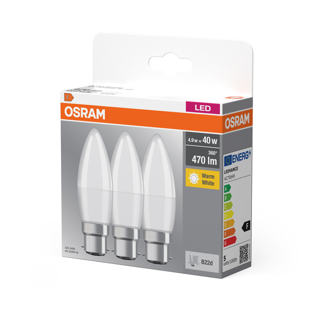 Lampy LED w kształcie klasycznej żarówki świecowej. Cechy produktu: Profesjonalne lampy dla napięcia sieciowego. Nieprzystosowane do pracy z regulatorami. Dobre oddawanie barw (R<sub>a</sub> ≥ 80) i stabilność braw przez cały czas eksploatacji lampy. Trzonek: E14, B22d. Lampy niezawierające rtęci. Zalety produktu: Niskie obciążenie cieplne (w porównaniu ze standardowym produktem referencyjnym). Niższe zużycie energii w porównaniu do lamp żarowych lub halogenowych. Odporność na wstrząsy i drgania dzięki technologii LED. Brak promieniowania UV i podczerwonego w wiązce światła. Natychmiast 100 % światła, bez czasu nagrzewania. Bezpośrednio zastępuje zwykłe żarówki. Obszary zastosowań: Oświetlenie ogólne. Zastosowania domowe. Żyrandole. Do użytku na zewnątrz tylko w odpowiednich oprawach zewnętrznych. Porady dotyczące bezpieczeństwa: Nie dotykaj lampy, jeśli jest stłuczona.. Nie wolno używać, jeśli zewnętrzne źródło światła jest uszkodzone..