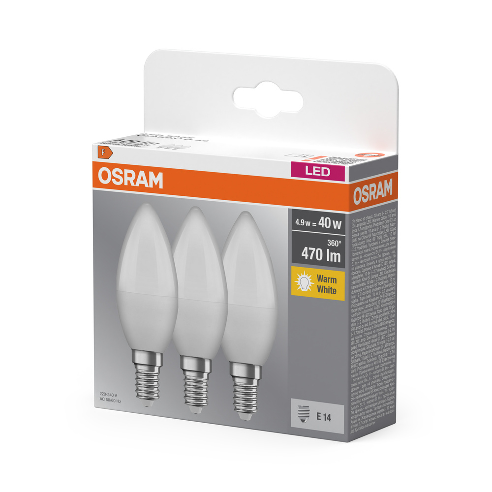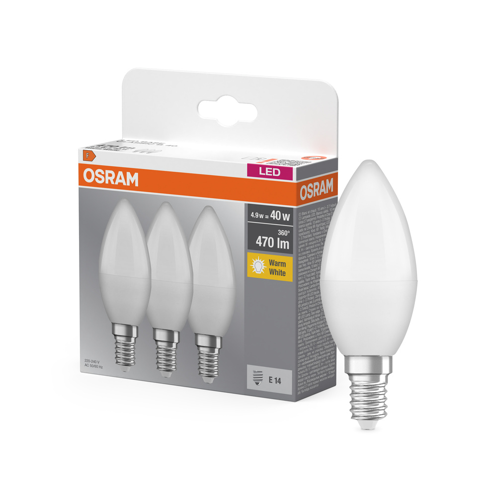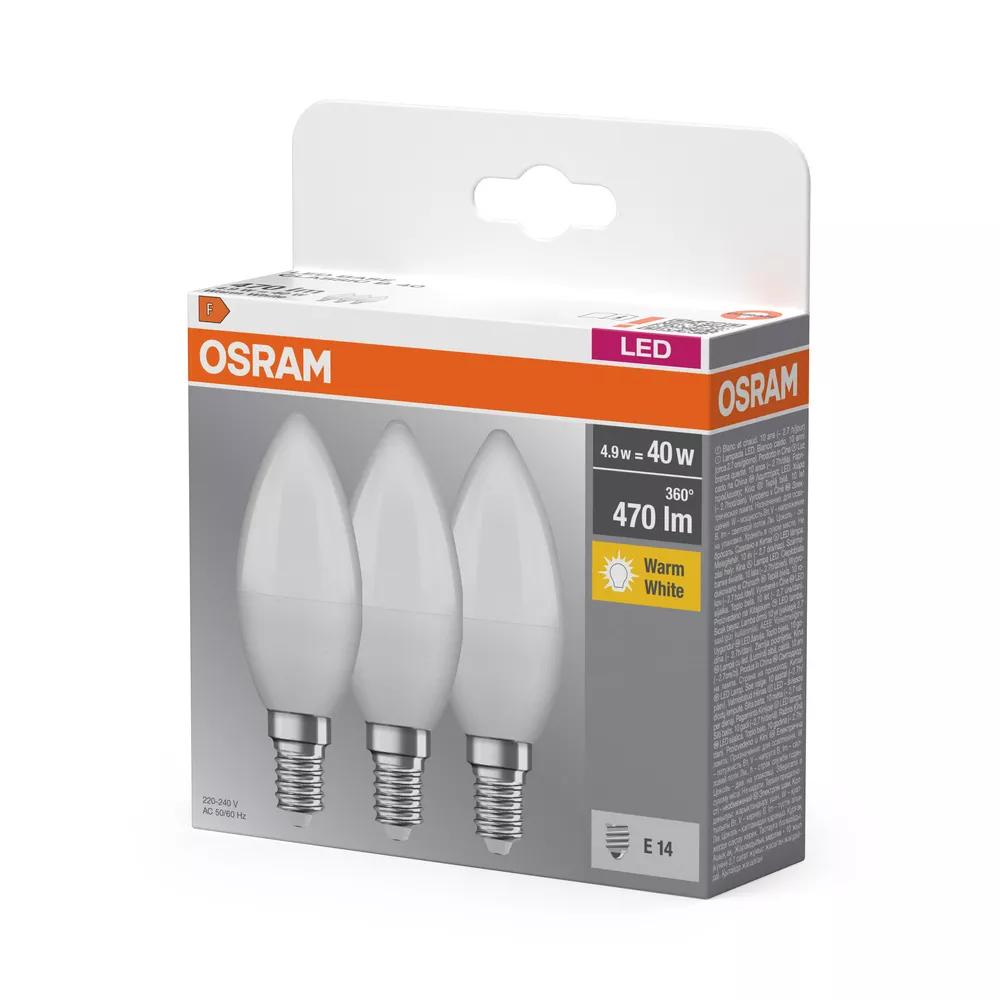 Lampy LED w kształcie klasycznej żarówki świecowej. Cechy produktu: Profesjonalne lampy dla napięcia sieciowego. Nieprzystosowane do pracy z regulatorami. Dobre oddawanie barw (Ra ≥ 80) i stabilność braw przez cały czas eksploatacji lampy. Trzonek: E14, B22d. Lampy niezawierające rtęci. Zalety produktu: Niskie obciążenie cieplne (w porównaniu ze standardowym produktem referencyjnym). Niższe zużycie energii w porównaniu do lamp żarowych lub halogenowych. Odporność na wstrząsy i drgania dzięki technologii LED. Brak promieniowania UV i podczerwonego w wiązce światła. Natychmiast 100 % światła, bez czasu nagrzewania. Bezpośrednio zastępuje zwykłe żarówki. Obszary zastosowań: Oświetlenie ogólne. Zastosowania domowe. Żyrandole. Do użytku na zewnątrz tylko w odpowiednich oprawach zewnętrznych. Porady dotyczące bezpieczeństwa: Nie dotykaj lampy, jeśli jest stłuczona.. Nie wolno używać, jeśli zewnętrzne źródło światła jest uszkodzone..