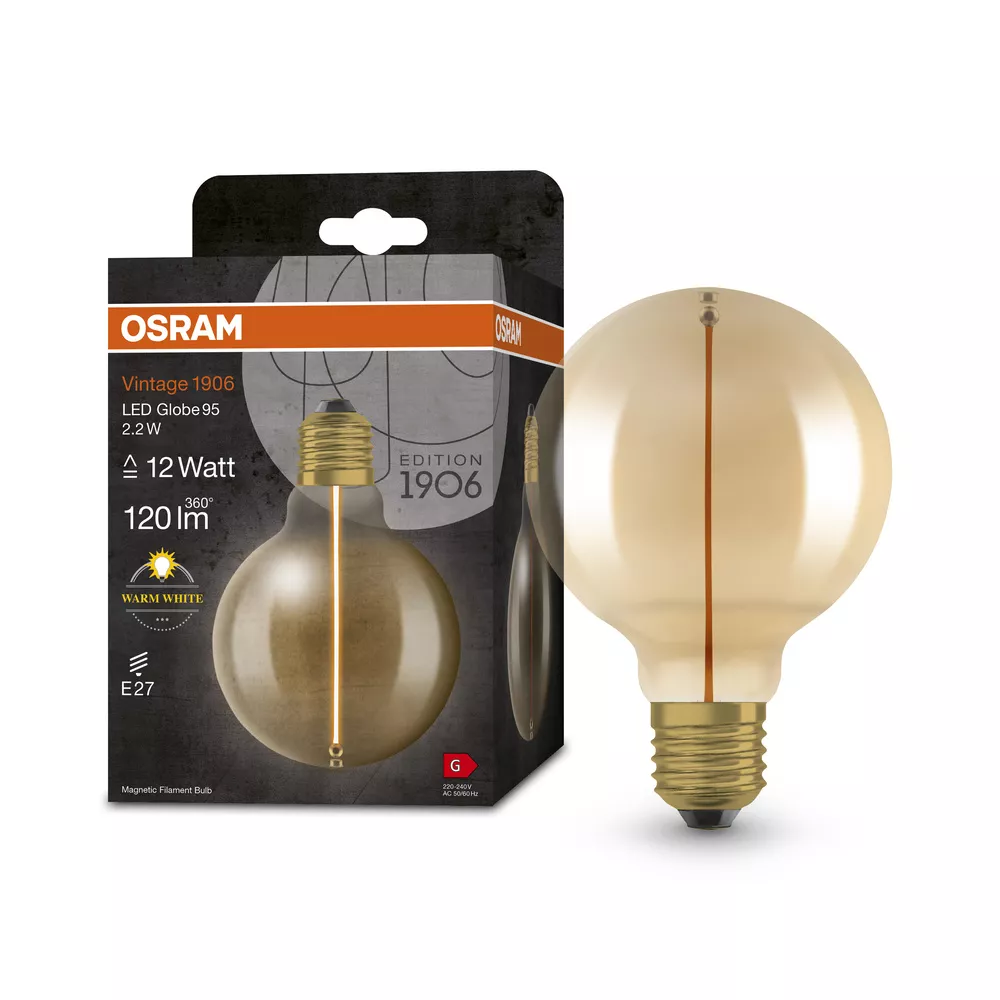 Lampy LED , dekoracyjne kształty żarówek, Edisona oraz klasyczne kształty żarówek kulistych z technologią filament-magnetic. Cechy produktu: Trwałość do 15 000 h. Dobra jakość światła, wskaźnik oddawania barw Ra: ≥ 80; stała chromatyczność. Lampa wykonana ze szkła. Dostępna w temperaturach barwowych: 2700 K, 1800 K. Przyjemne światło: ciepłobiała barwa światła. Zalety produktu: Niższe zużycie energii w porównaniu do lamp żarowych lub halogenowych. Natychmiast 100 % światła, bez czasu nagrzewania. Łatwy montaż zamiast zwykłych żarówek. Stopień ochrony: IP20, Idealny do użytku w pomieszczeniach zamkniętych. Lampy dekoracyjne wykorzystujące innowacyjną technologię LED „filament-magnetic”.. Brak uchwytu na żarnik: Idealny do instalacji dekoracyjnych. Dostępne różne kształty i średnice baniek. Obszary zastosowań: Doskonałe rozwiązanie do instalacji dekoracyjnych. Zastosowania domowe. Oświetlenie ogólne. Do użytku na zewnątrz tylko w odpowiednich oprawach zewnętrznych. Porady dotyczące bezpieczeństwa: Nie dotykaj lampy, jeśli jest stłuczona.. Nie wolno używać, jeśli zewnętrzne źródło światła jest uszkodzone..
