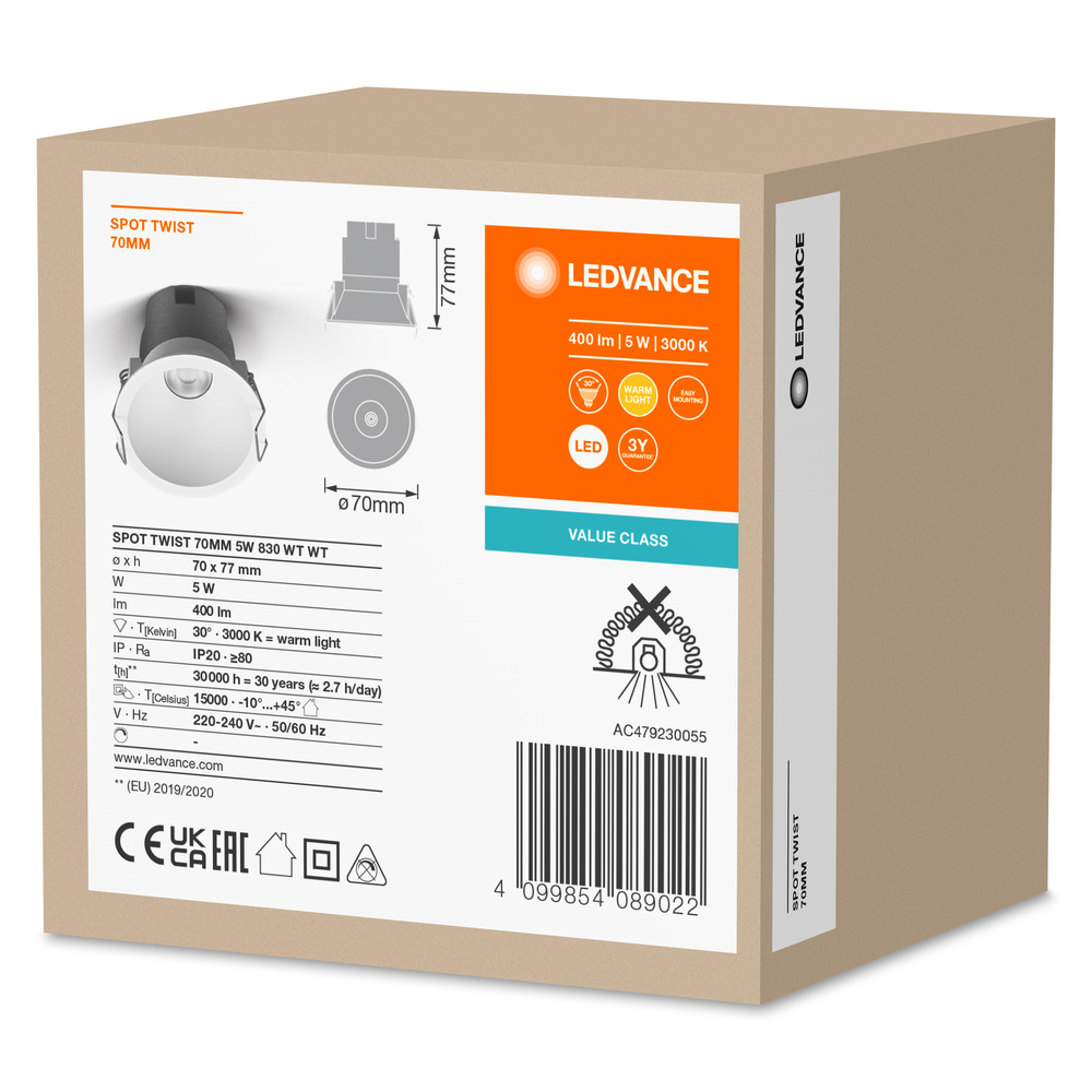 Reflektor do wbudowania ze zintegrowaną LED. Cechy produktu: Sprężyny zabezpieczone podkładkami silikonowymi. Zalety produktu: Aż do 90 % oszczędność energii w porównaniu z punktowymi oprawami halogenowymi. Łatwa instalacja i podłączenie elektryczne dzięki beznarzędziowym złączom elektrycznym. Obszary zastosowań: Zastosowania wewnętrzne. Oświetlenie ogólne. Wyposażenie / Akcesoria: Złącze nie jest dołączone. Porady dotyczące bezpieczeństwa: Wszystkie podłączenia elektryczne muszą być wykonane przez osobę wykwalifikowaną.. Uwaga, ryzyko porażenia prądem.. Oprawy nie nadają się do pokrywania materiałem termoizolacyjnym.. Sprawdź przydatność ściany i sufitu. Jeśli nie jesteś pewien, zasięgnij profesjonalnej porady..