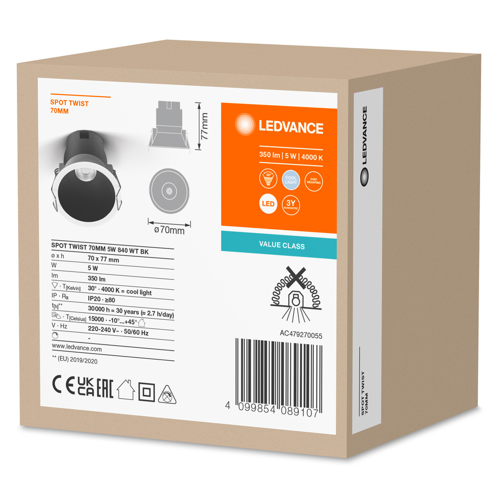 Reflektor do wbudowania ze zintegrowaną LED. Cechy produktu: Sprężyny zabezpieczone podkładkami silikonowymi. Zalety produktu: Aż do 90 % oszczędność energii w porównaniu z punktowymi oprawami halogenowymi. Łatwa instalacja i podłączenie elektryczne dzięki beznarzędziowym złączom elektrycznym. Obszary zastosowań: Zastosowania wewnętrzne. Oświetlenie ogólne. Wyposażenie / Akcesoria: Złącze nie jest dołączone. Porady dotyczące bezpieczeństwa: Wszystkie podłączenia elektryczne muszą być wykonane przez osobę wykwalifikowaną.. Uwaga, ryzyko porażenia prądem.. Oprawy nie nadają się do pokrywania materiałem termoizolacyjnym.. Sprawdź przydatność ściany i sufitu. Jeśli nie jesteś pewien, zasięgnij profesjonalnej porady..