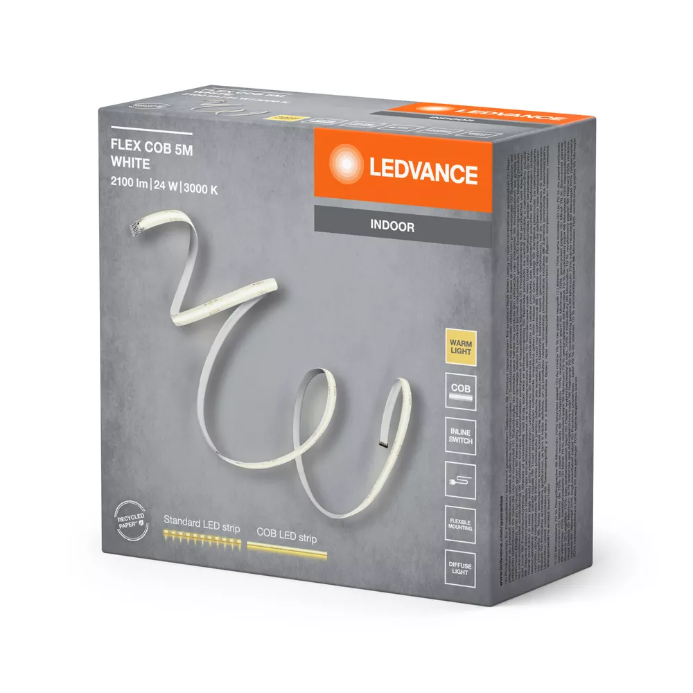Dekoracyjne paski COB emitujące ciepłe białe światło i jednorodny efekt świetlny. Cechy produktu: Technologia COB zapewniająca równomierny rozsył światła. Barwa światła: Warm White (ciepłobiała). Elastyczne taśmy LED, które można wyginać. Zalety produktu: Łatwa i szybka instalacja. Jednorodne oświetlenie dzięki COB LED. Obszary zastosowań: Pomieszczenia codziennego użytku. Oświetlenie pośrednie. Wyposażenie / Akcesoria: Kompletne akcesoria do montażu i podłączenia w zestawie. Porady dotyczące bezpieczeństwa: Aby ograniczyć ryzyko uduszenia, elastyczne przewody PODŁĄCZONE do tej oprawy należy solidnie przymocować do ściany, jeśli znajdują się w zasięgu ręki..