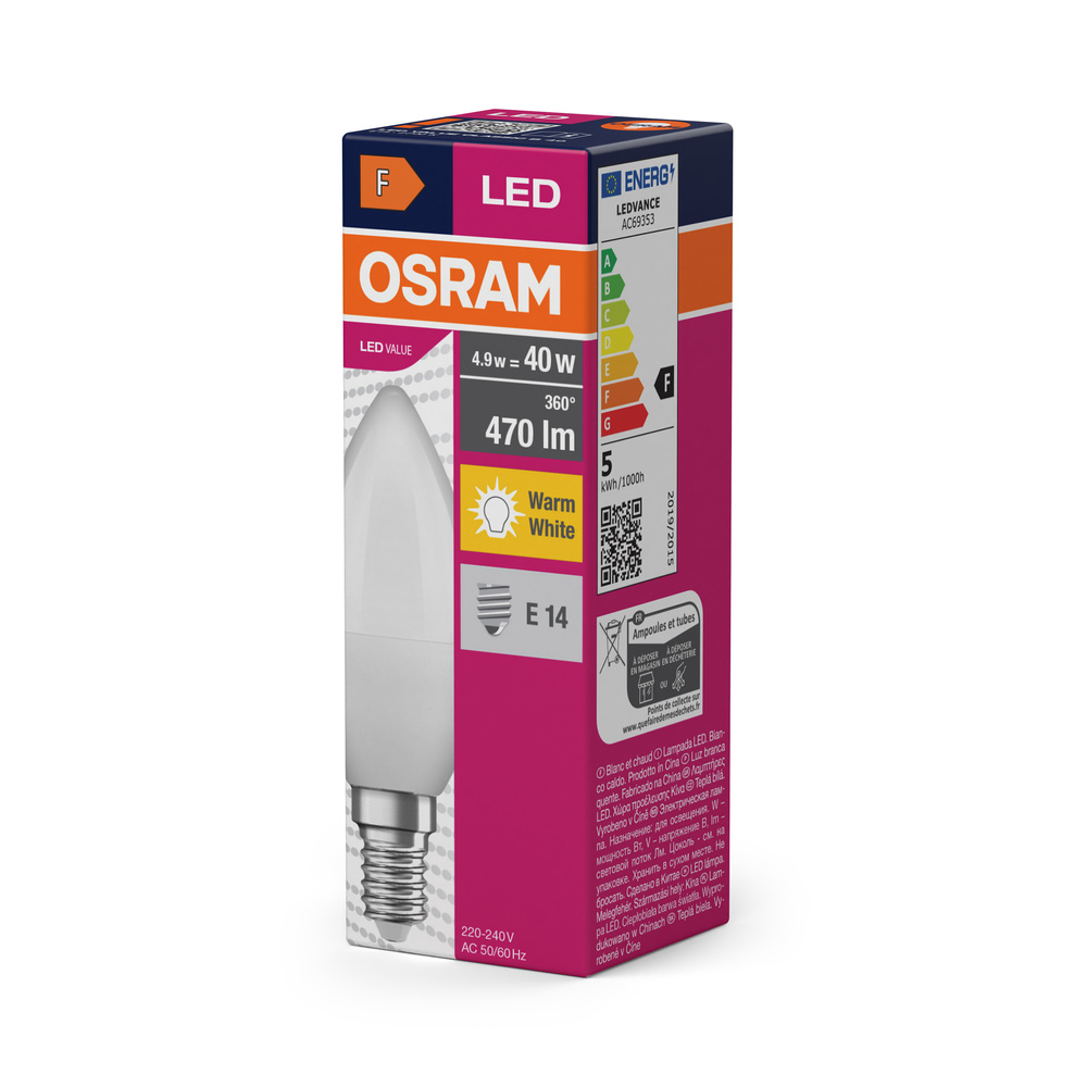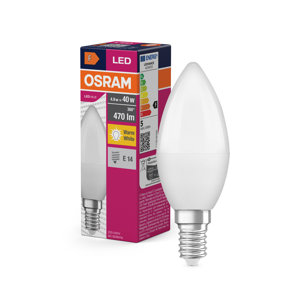 Lampy LED w kształcie klasycznej żarówki świecowej. Cechy produktu: LED zamienniki tradycyjnych żarówek. Brak możliwości regulacji strumienia świetlnego. Dobre oddawanie barw (Ra ≥ 80) i stabilność braw przez cały czas eksploatacji lampy. Zalety produktu: Niższe zużycie energii w porównaniu do lamp żarowych lub halogenowych. Bezpośrednio zastępuje zwykłe żarówki. Natychmiast 100 % światła, bez czasu nagrzewania. Obszary zastosowań: Oświetlenie ogólne. Zastosowania domowe. Żyrandole. Do użytku na zewnątrz tylko w odpowiednich oprawach zewnętrznych. Porady dotyczące bezpieczeństwa: Nie dotykaj lampy, jeśli jest stłuczona.. Nie wolno używać, jeśli zewnętrzne źródło światła jest uszkodzone..