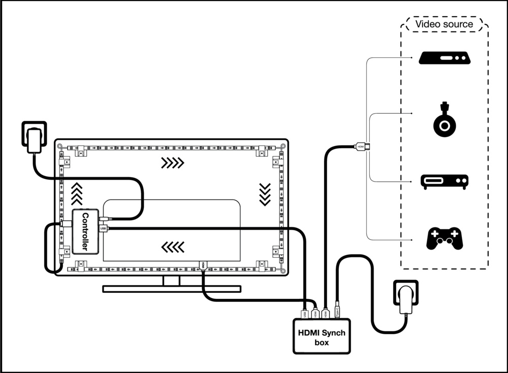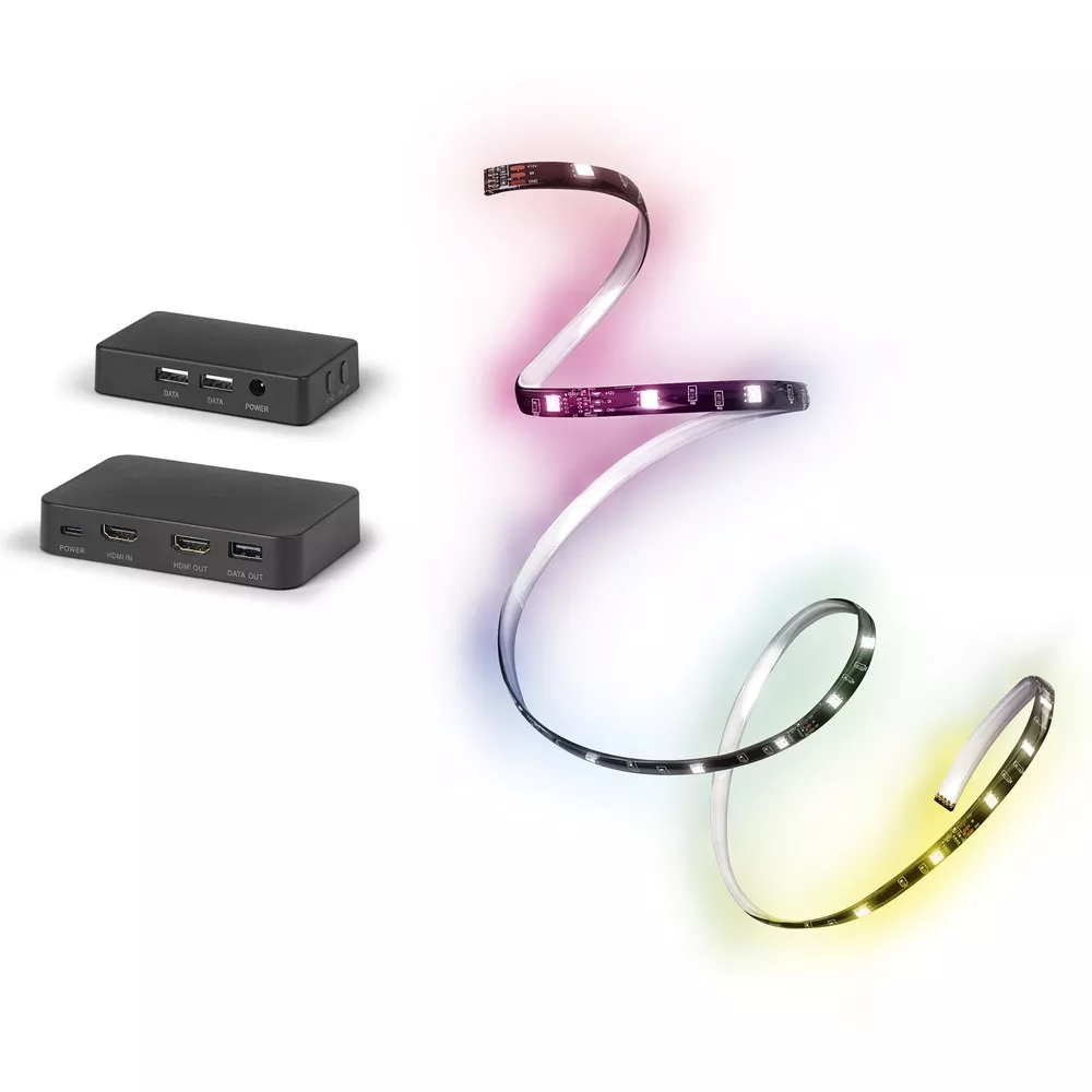 Paski LED HDMI Sync z technologią WiFi i MAGIC RGB. Cechy produktu: Ściemnialne. Sterowanie kolorami RGB. Funkcja DIY: możesz dostosować segment koloru i stworzyć własne sceny oświetleniowe lub po prostu użyć już dostępnych scen oświetleniowych. Sterowanie za pomocą aplikacji LEDVANCE SMART + WiFi (z co najmniej Androidem 4.4 lub iOS 10.0). Elastyczne taśmy LED, które można wyginać. Zalety produktu: Łatwa i szybka instalacja. MAGIC RGB Color Control dla maksymalnej elastyczności wyboru. Zsynchronizuj Smart Flex Strip z treścią na ekranie. Obszary zastosowań: Pomieszczenia codziennego użytku. Oświetlenie pośrednie. Domowe obszary rozrywki. Kąciki do gier. Odpowiedni rozmiar telewizora 55”-65” (140-165 cm). Wyposażenie / Akcesoria: Kompletne akcesoria do montażu i podłączenia w zestawie. Skrzynka synchronizacji i skrzynka kontrolna w zestawie. W zestawie znajduje się przewód łączący. Porady dotyczące bezpieczeństwa: Nie należy włączać zasilania paska LED, gdy jest on nawinięty na szpulę. Nie należy używać paska LED, gdy jest ona przykryta lub wpuszczona w powierzchnię. Nie wolno używać paska LED w opakowaniu. Nie należy otwierać taśmy świetlnej..