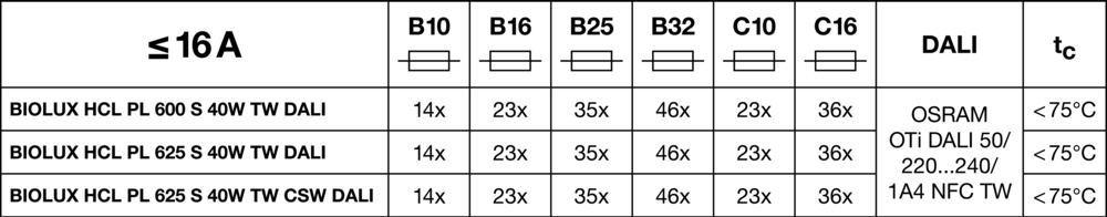 | Maks. liczba opraw na wyłącznik nadprądowy B16: | 23 |