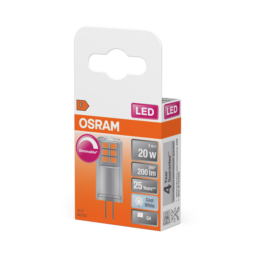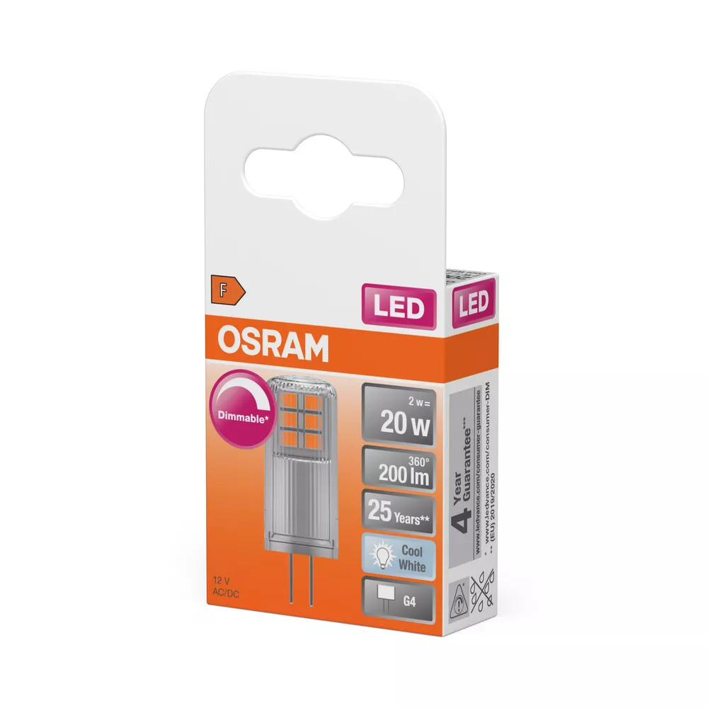Ściemnialne niskonapięciowe lampy LED 12 V z trzonkiem kołkowym. Cechy produktu: Ściemnialne (za pomocą licznych popularnych ściemniaczy, zobacz więcej www.ledvance.pl/dim). Zgodność z wieloma konwencjonalnymi i elektronicznymi zasilaczami (patrz również compatibility list). Zamiennik LED dla niskonapięciowych żarówek halogenowych. Trzonek: G4, GY6.35. Zalety produktu: Praca alternatywnie z zasilaniem prądem stałym lub przemiennym. Równomierny rozsył światła we wszystkich kierunkach. Idealne do zastosowania dekoracyjnego oraz do eksploatacji bez oprawy. Długa trwałość do 25 000 godzin. 4-letnia gwarancja. Niższe zużycie energii w porównaniu do lamp żarowych lub halogenowych. Obszary zastosowań: Zastosowania dekoracyjne. Nastrojowe oświetlenie akcentujące w całym domu. Do użytku na zewnątrz tylko w odpowiednich oprawach zewnętrznych. Porady dotyczące bezpieczeństwa: Nie dotykaj lampy, jeśli jest stłuczona.. Nie wolno używać, jeśli zewnętrzne źródło światła jest uszkodzone.. Aby zapewnić pełną wydajność oświetlenia i trwałość produktu, zalecane jest demontaż szyby lub osłony oprawy oświetleniowej..