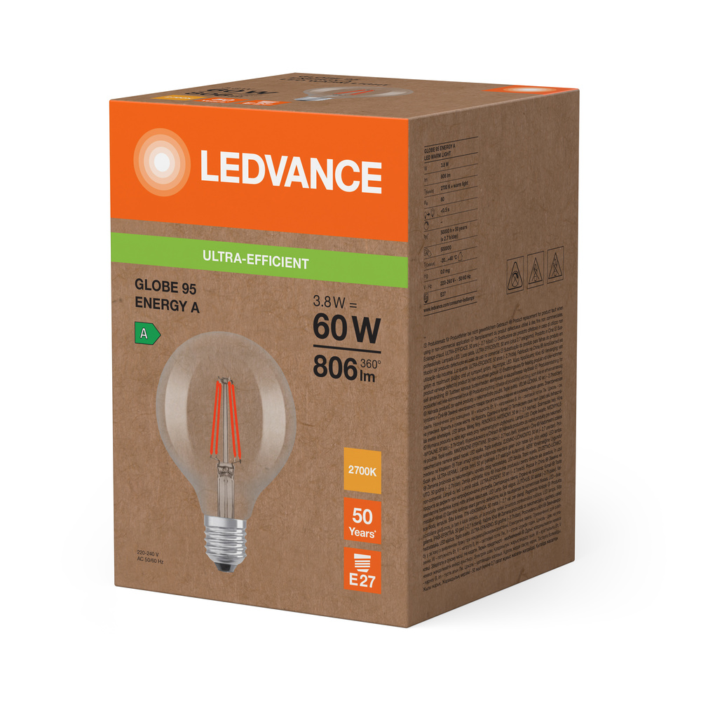Lampy LED, klasyczny kształt żarówki kulistej, KLASA EFEKTYWNOŚCI ENERGETYCZNEJ A. Cechy produktu: Lampy LED dla napięcia sieciowego. Skuteczność świetlna do 210 lm/W. Kąt wiązki światła: do 300°. Długa trwałość do 50 000 godzin. Bardzo duża liczba cykli przełączania 500 000. Zalety produktu: Lampy wyposażone w innowacyjną technologię „włókien” LED. Niskie zużycie energii. Wygląd, wymiary i strumień świetlny porównywalne z żarówkami halogenowymi. Natychmiast 100 % światła, bez czasu nagrzewania. Niskie tętnienie światła. Obszary zastosowań: Doskonałe rozwiązanie do instalacji dekoracyjnych. Zastosowania domowe. Oświetlenie ogólne. Do użytku na zewnątrz tylko w odpowiednich oprawach zewnętrznych. Porady dotyczące bezpieczeństwa: Nie dotykaj lampy, jeśli jest stłuczona.. Nie wolno używać, jeśli zewnętrzne źródło światła jest uszkodzone..