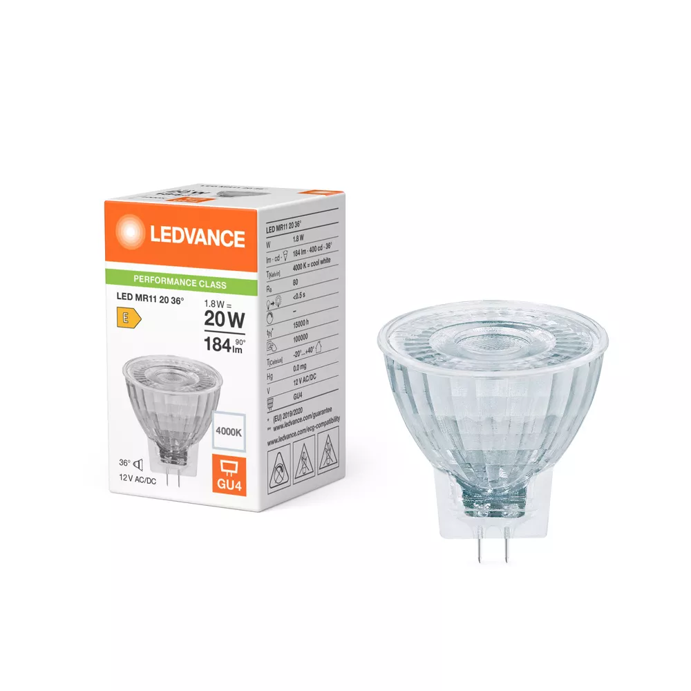 Niskonapięciowe reflektorowe lampy LED MR11 z trzonkiem kołkowym. Cechy produktu: Zamiennik LED dla niskonapięciowych żarówek halogenowych. Wysoka jedorodność barw: ≤ 6 SDCM. Brak możliwości regulacji strumienia świetlnego. Trzonek: GU4. Lampa wykonana ze szkła. Dobra jakość światła, wskaźnik oddawania barw Ra: ≥ 80. Trwałość do 15 000 h. Zalety produktu: Szybka, prosta i bezpieczna wymiana bez zmiany okablowania. Wygląd, wymiary i strumień świetlny porównywalne z tradycyjnymi żarówkami lub żarówkami halogenowymi. Niski koszt konserwacji dzięki długiej trwałości. Brak promieniowania UV i podczerwonego w wiązce światła. Kompatybilny z wieloma popularnymi statecznikami konwencjonalnymi i elektronicznymi (patrz także Hyperlink target ="https://www.ledvance.com/low-voltage-ledlamps"lista kompatybilności/Hyperlink). Natychmiast 100 % światła, bez czasu nagrzewania. Niższe zużycie energii w porównaniu do lamp żarowych lub halogenowych. Obszary zastosowań: Sklepy i pomieszczenia wystawowe. Zastosowania domowe. Zastosowania komercyjne. Oświetlenie akcentujące. Do użytku na zewnątrz tylko w odpowiednich oprawach zewnętrznych. Porady dotyczące bezpieczeństwa: Nie dotykaj lampy, jeśli jest stłuczona.. Nie wolno używać, jeśli zewnętrzne źródło światła jest uszkodzone..